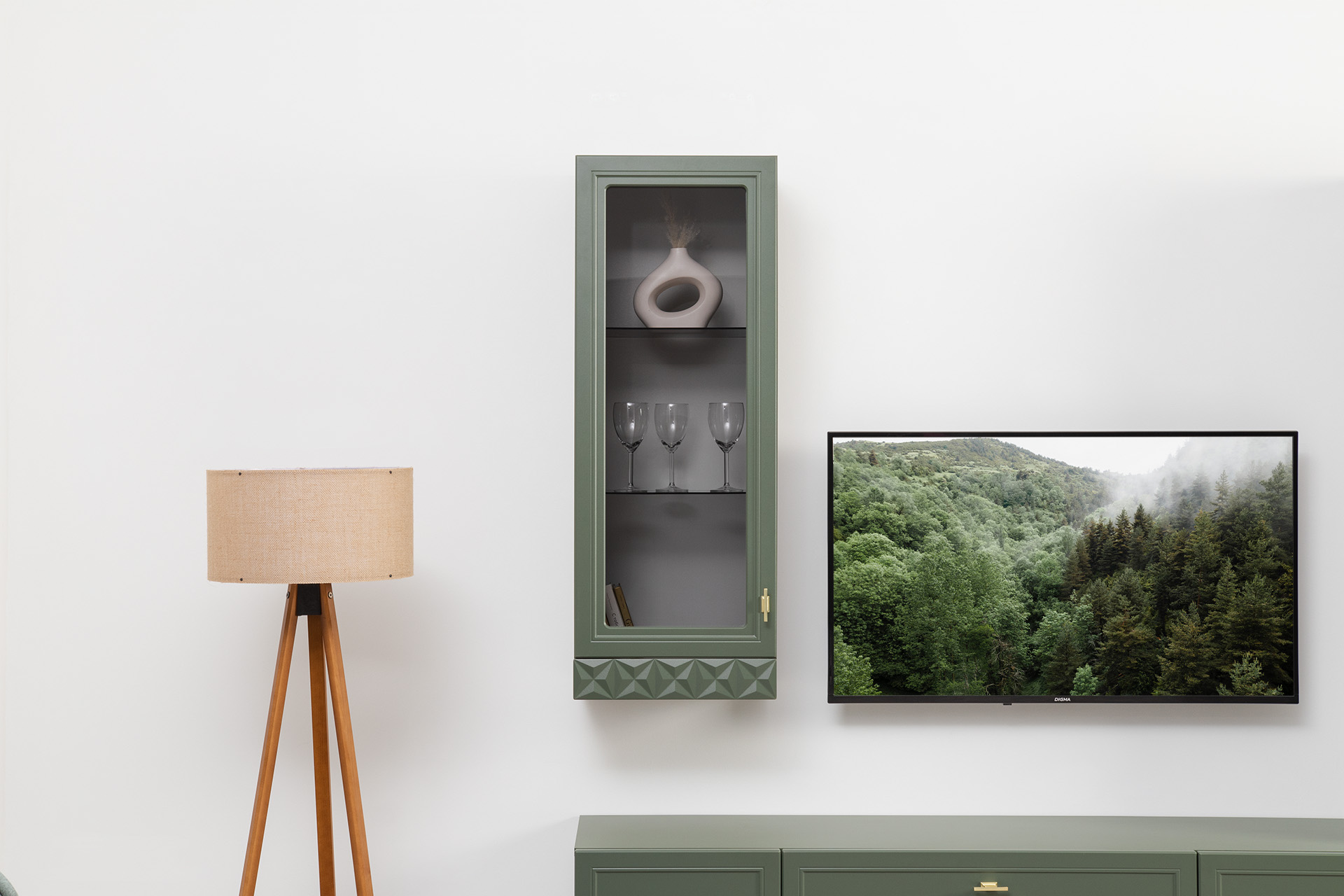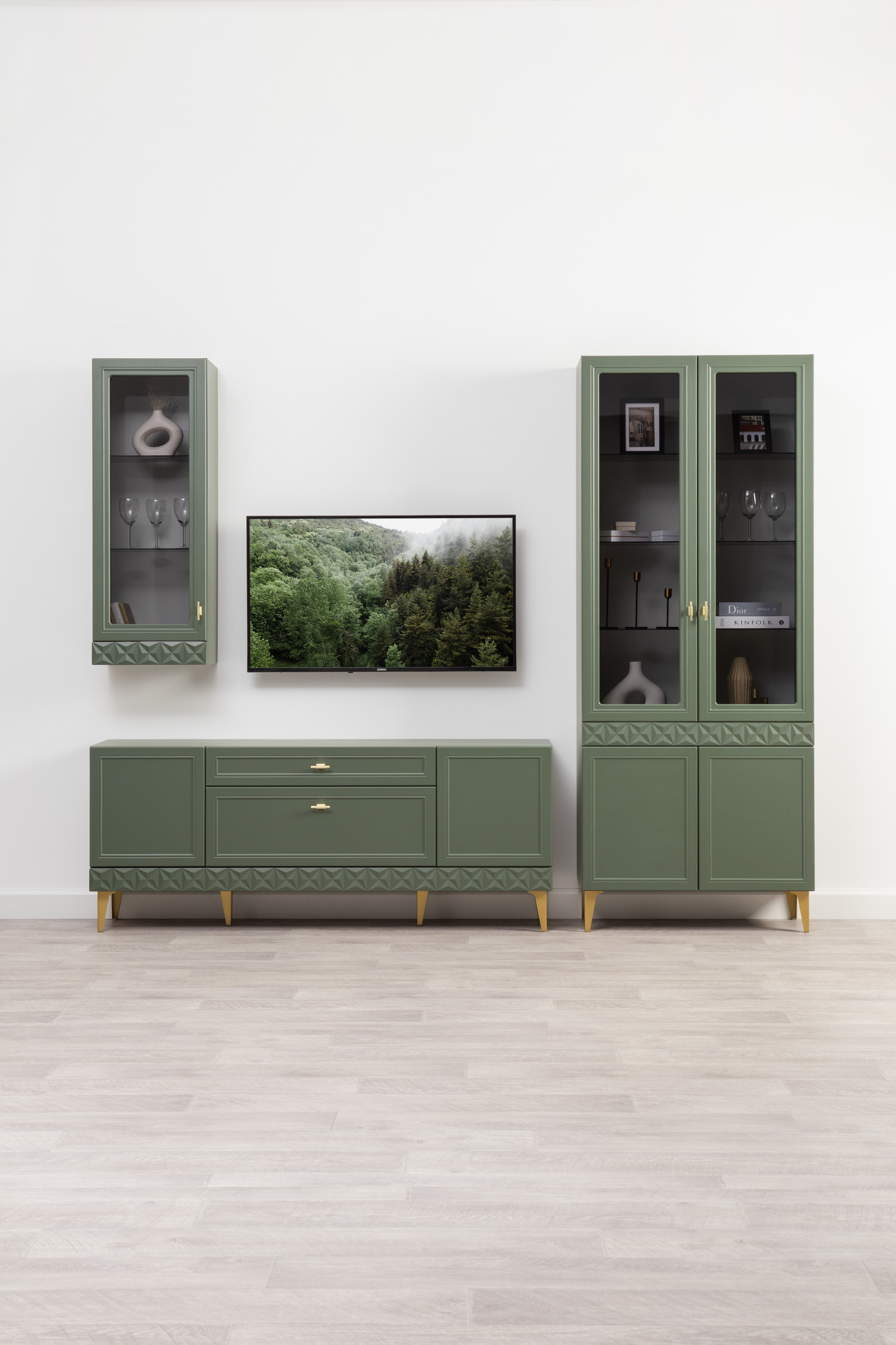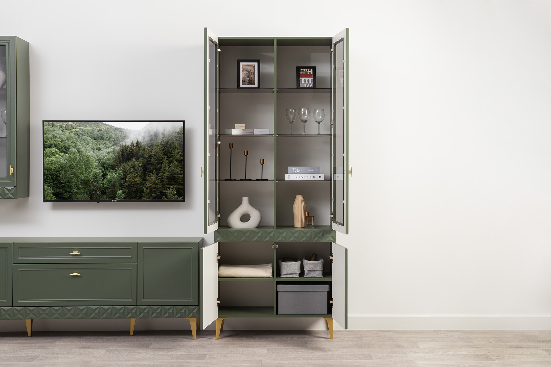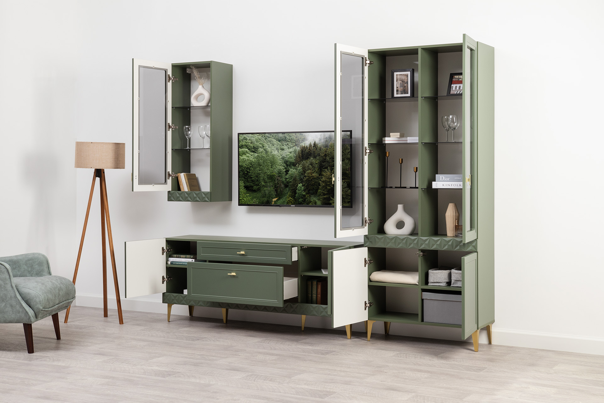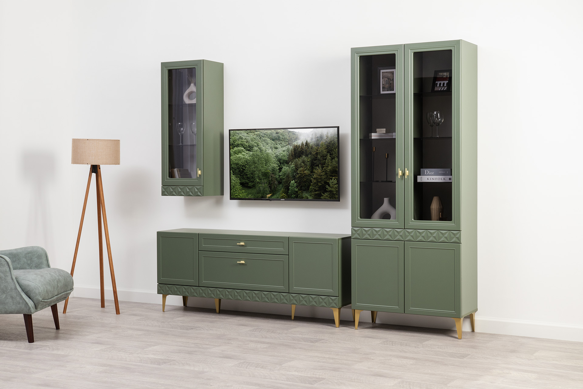 Гостиная Марион композиция 2 дымчатый зеленый K521, олива шагрень AG 1050 ПВХ, белый PE шагрень (собирается на любую сторону)