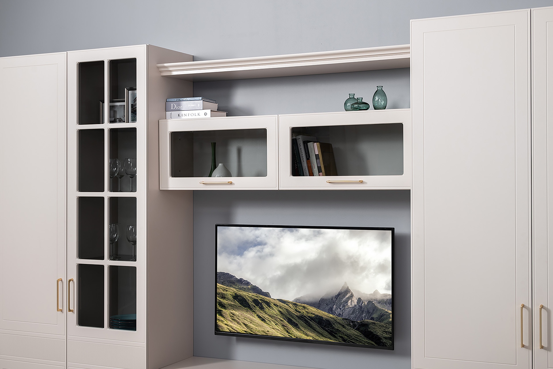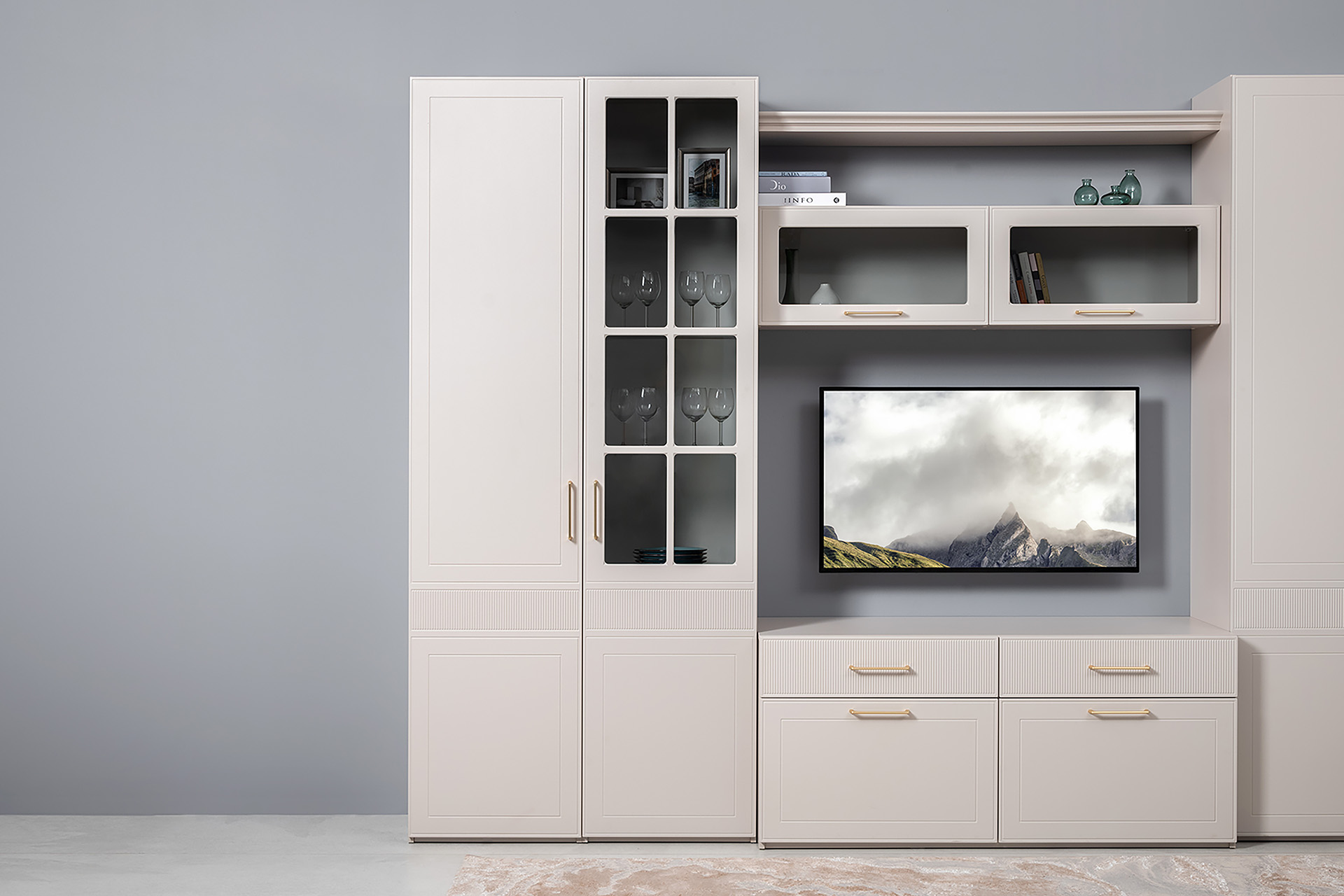 Гостиная Ричфорд композиция 1 без карнизов, кашемир 5981 BS, моно керамика D166-2 ПВХ, белый PE шагрень (собирается на любую сторону)