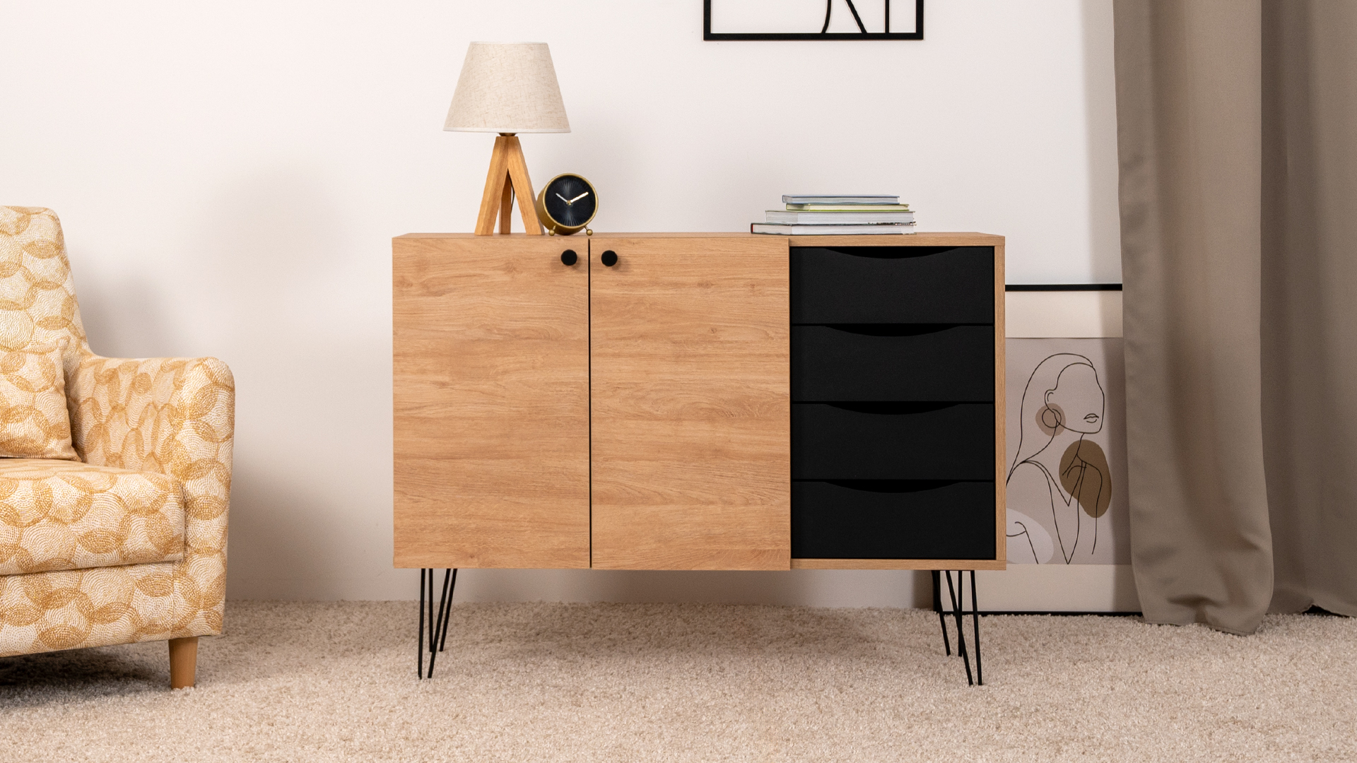 Лаконичный и стильный комод Брюс на высоких металлических опорах будет уместен в интерьере современной гостиной, спальни, прихожей.