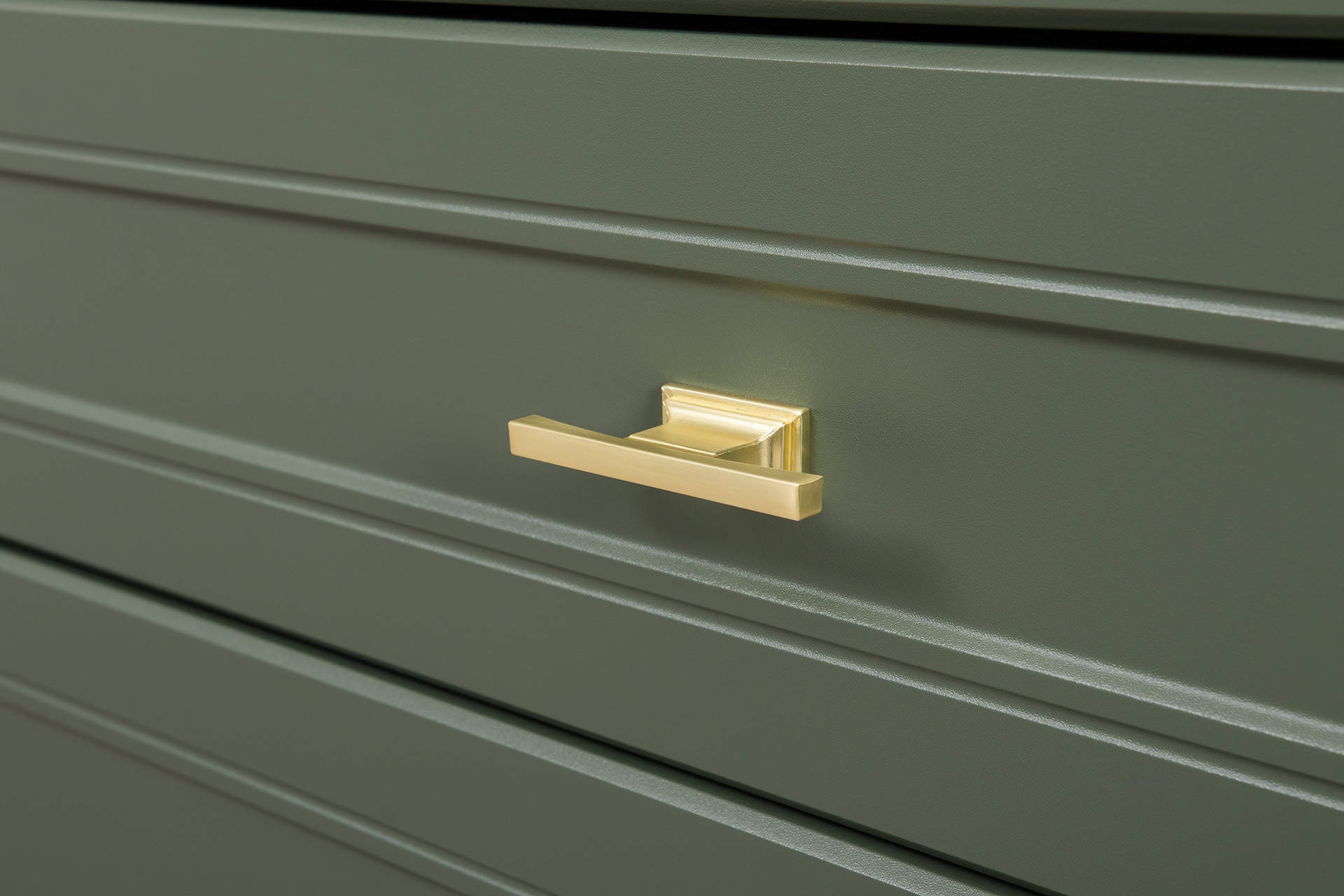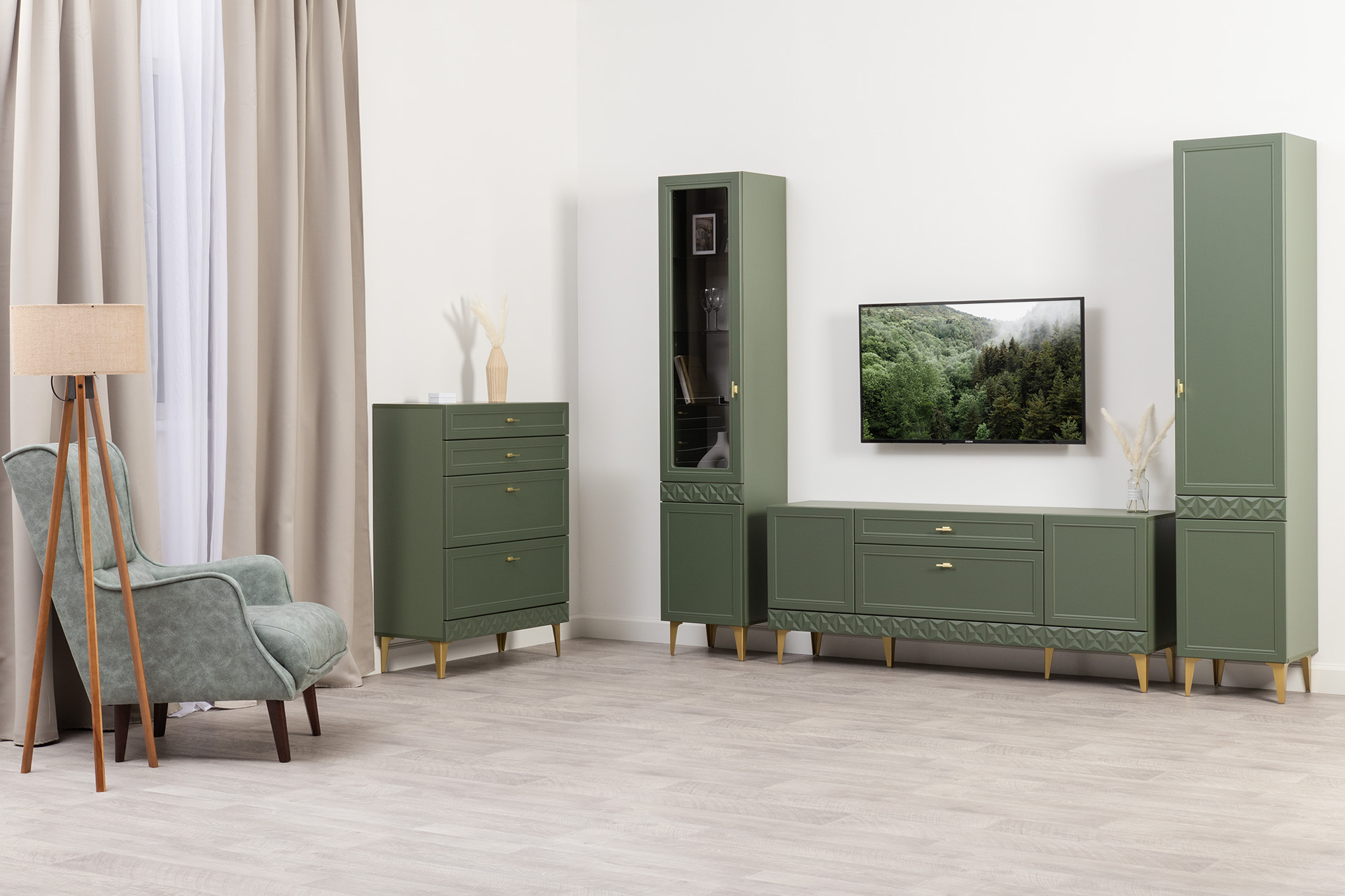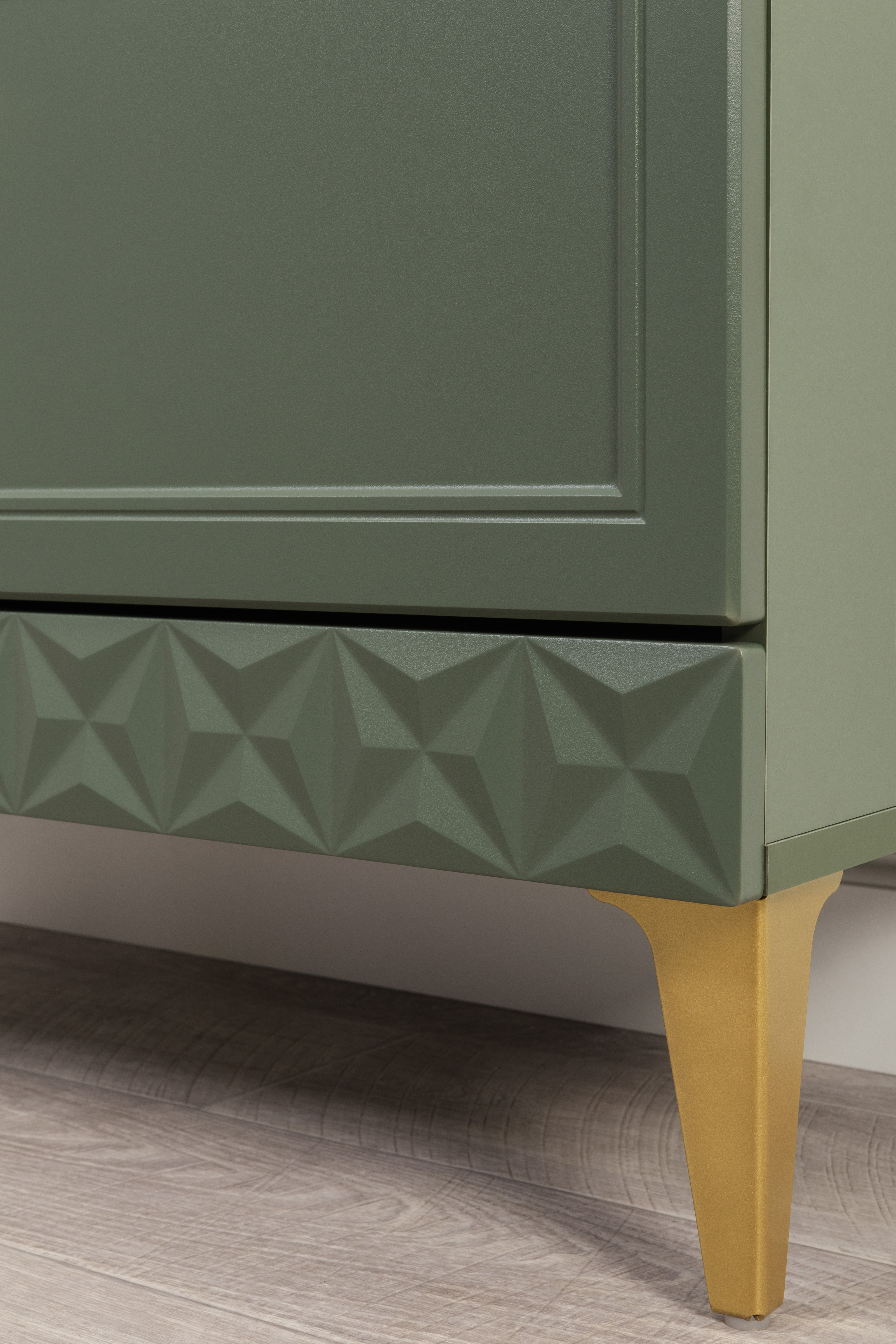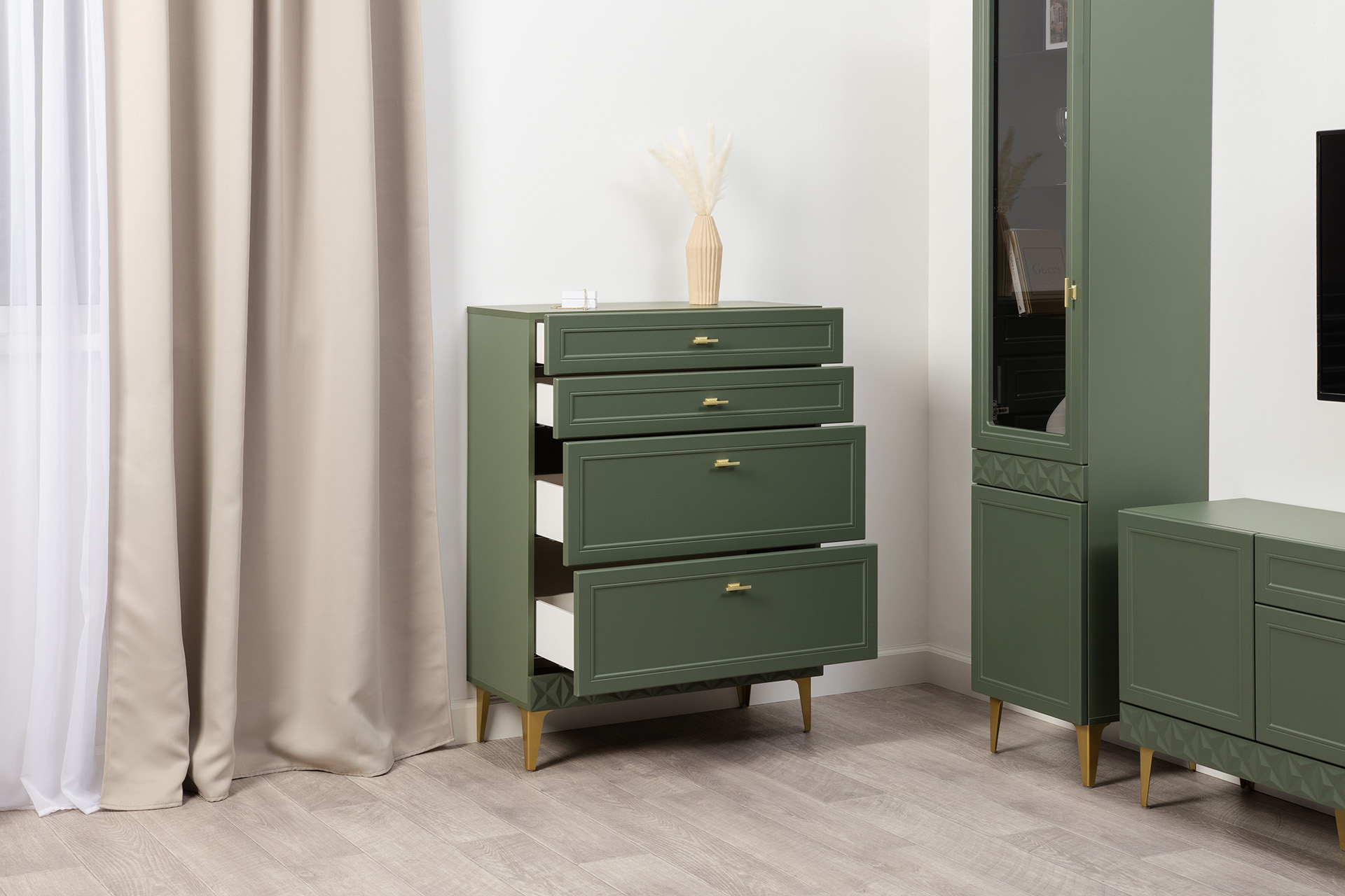 Комод Марион 16.249 дымчатый зеленый K521, олива шагрень AG 1050 ПВХ, белый PE шагрень