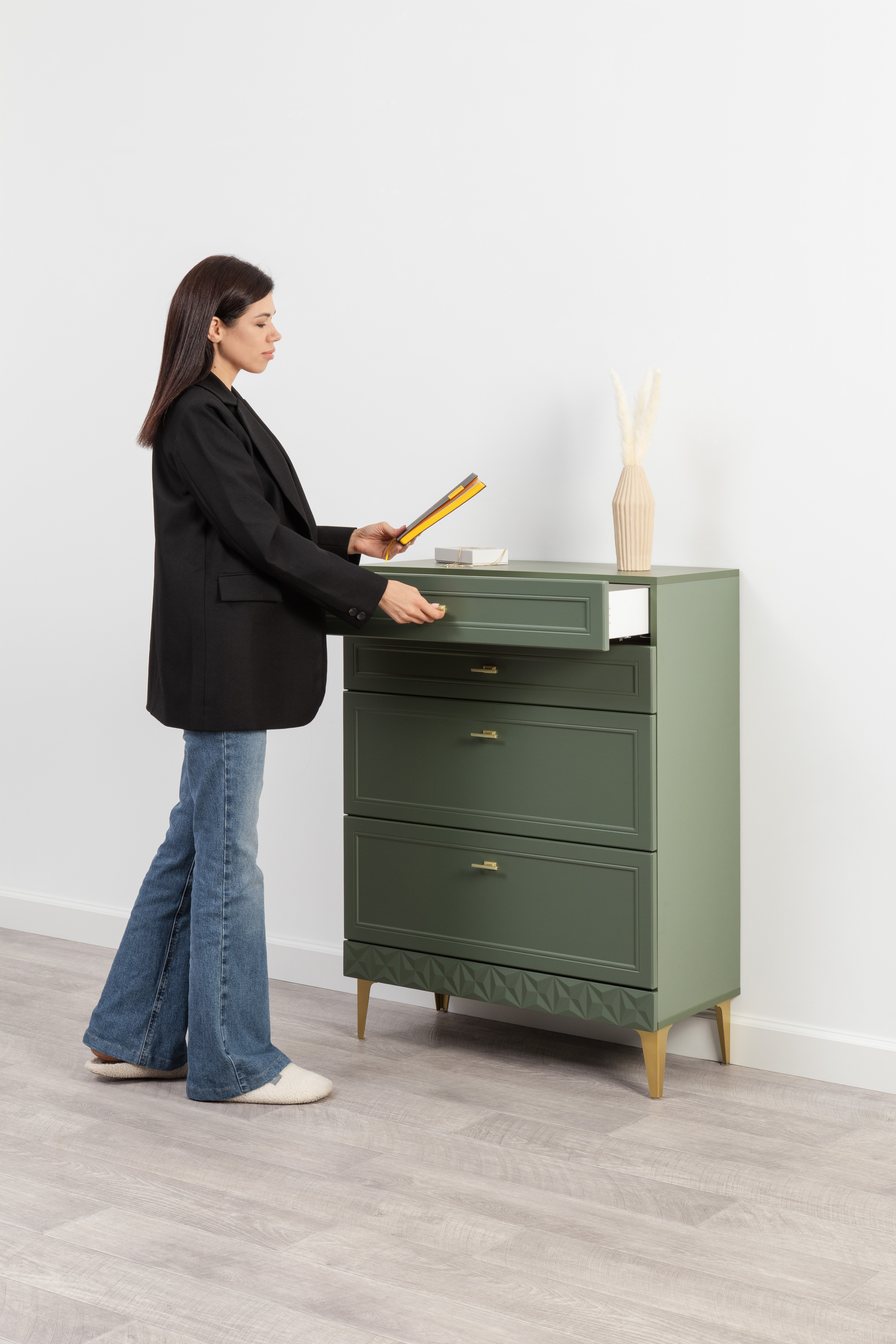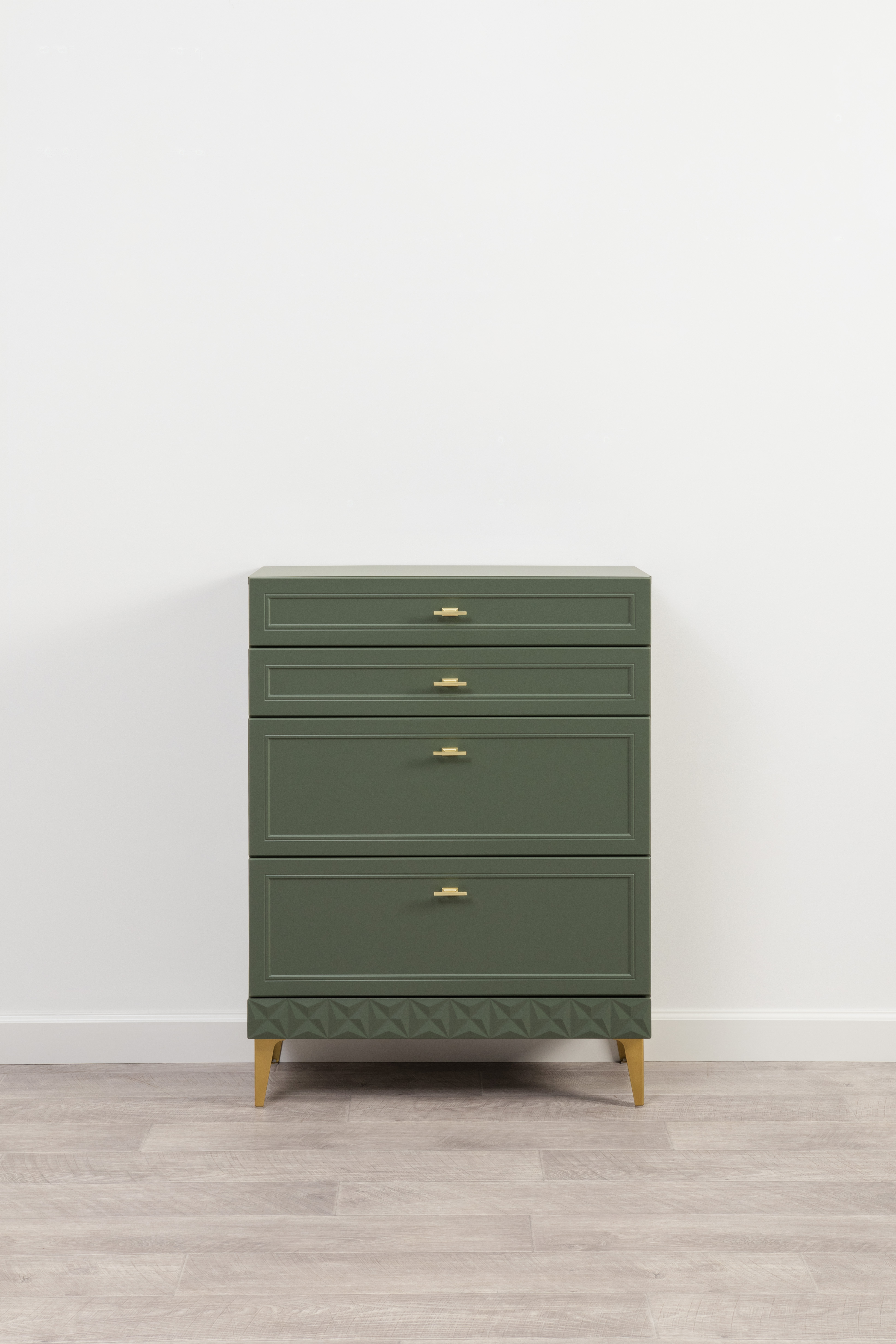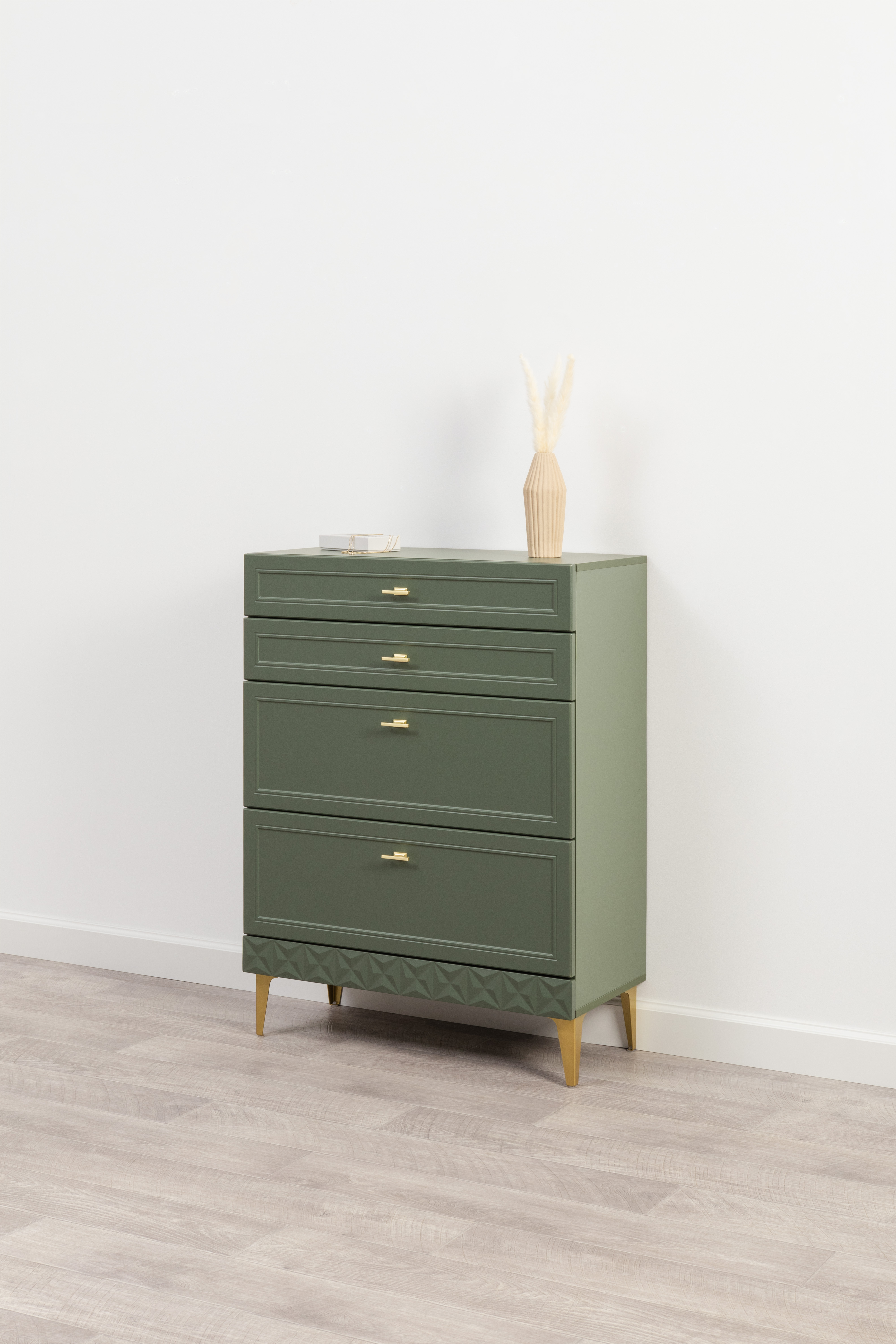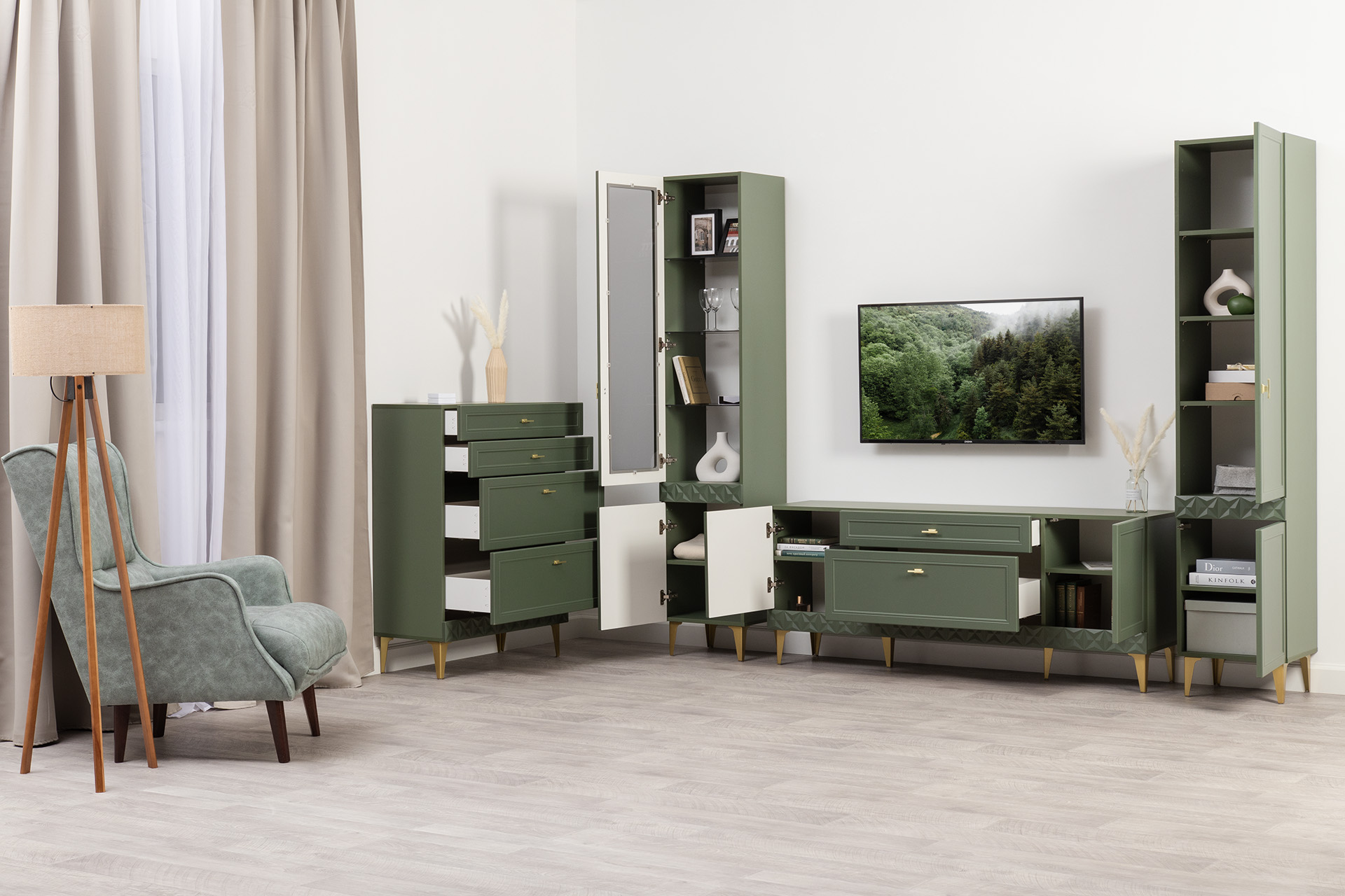 Комод Марион 16.249 дымчатый зеленый K521, олива шагрень AG 1050 ПВХ, белый PE шагрень
