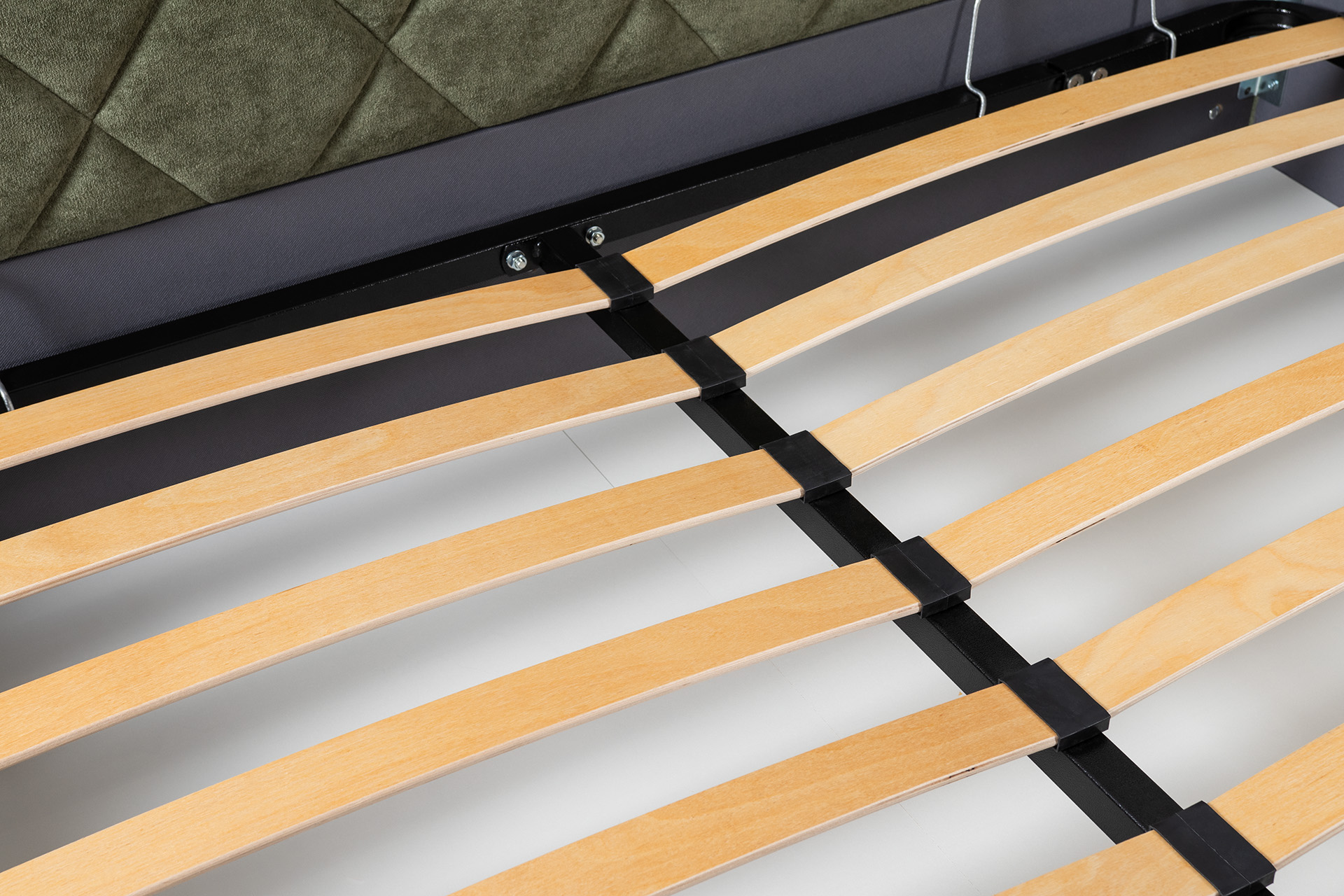 Основание кровати укомплектовано матрасодержателями. Жесткое кроватное дно из ЛДСП 16 мм на опорах 25 мм.