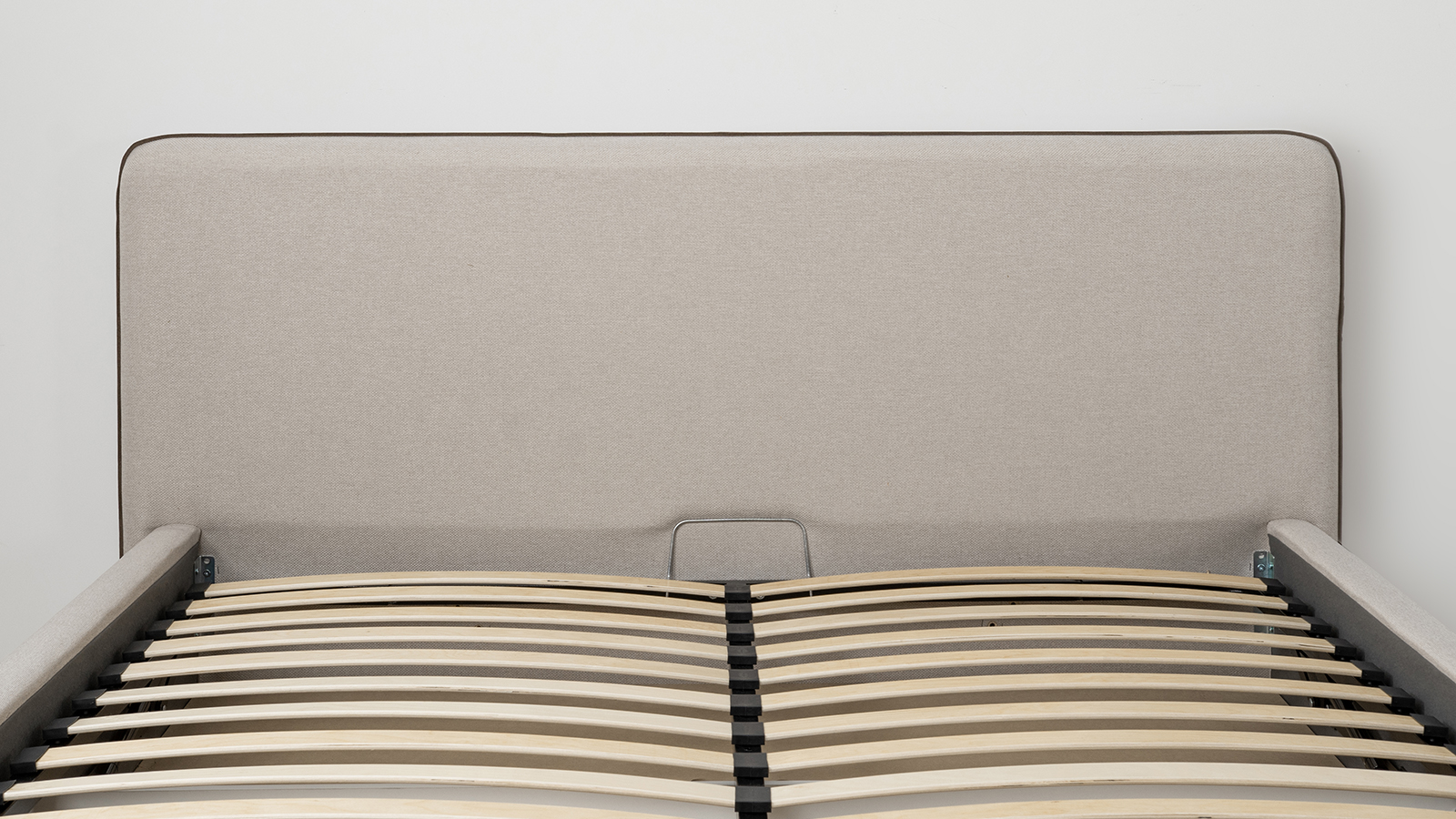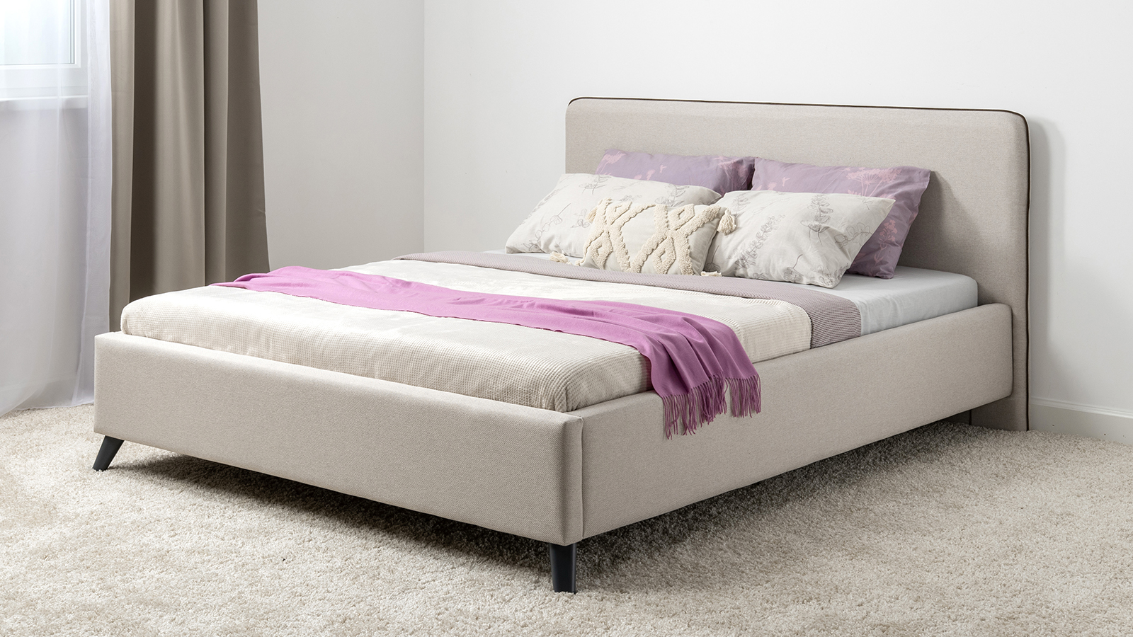 Кровать Миа 160 рогожка светло-бежевый, кант желтовато-коричневый с ортопедическим основанием и подъемным механизмом