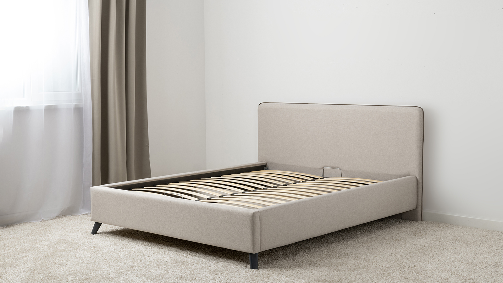 Кровать Миа 140 рогожка светло-бежевый, кант желтовато-коричневый с ортопедическим основанием и подъемным механизмом
