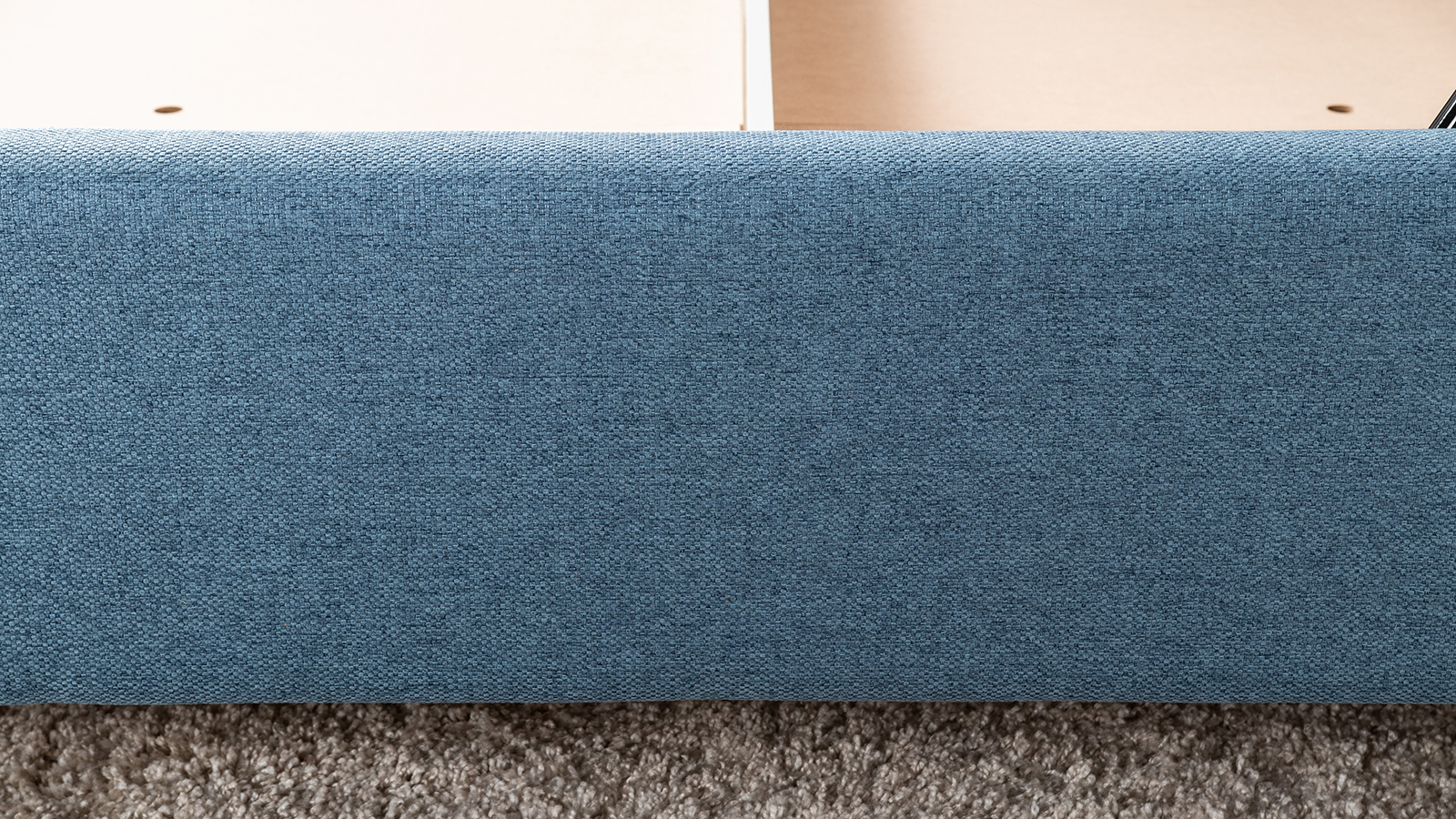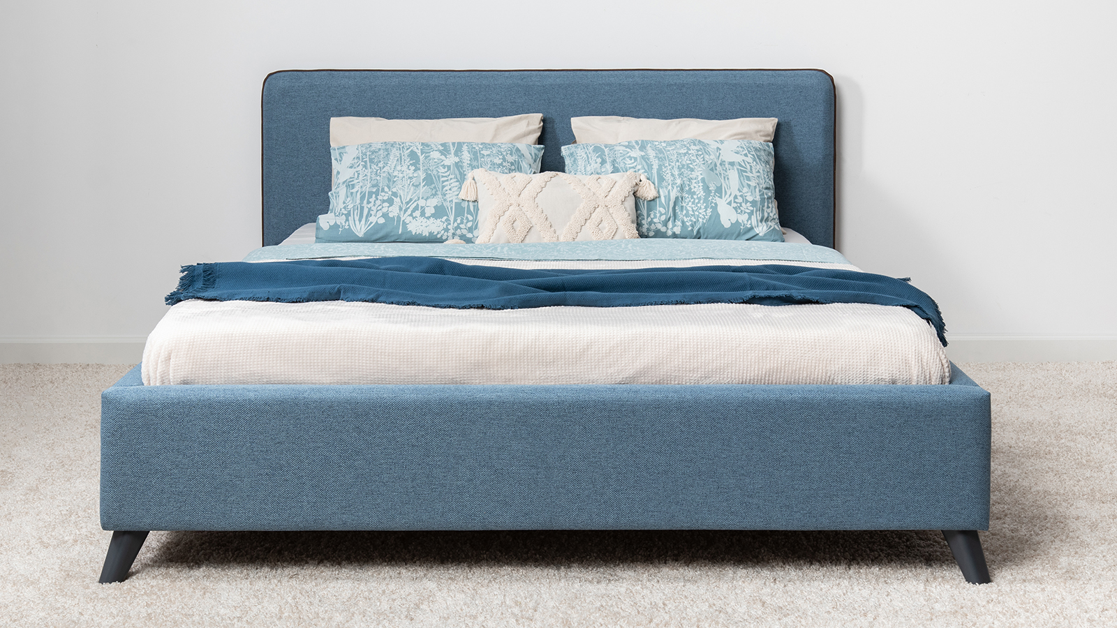 Кровать Миа 140 рогожка светло-синий, кант желтовато-коричневый с ортопедическим основанием и подъемным механизмом