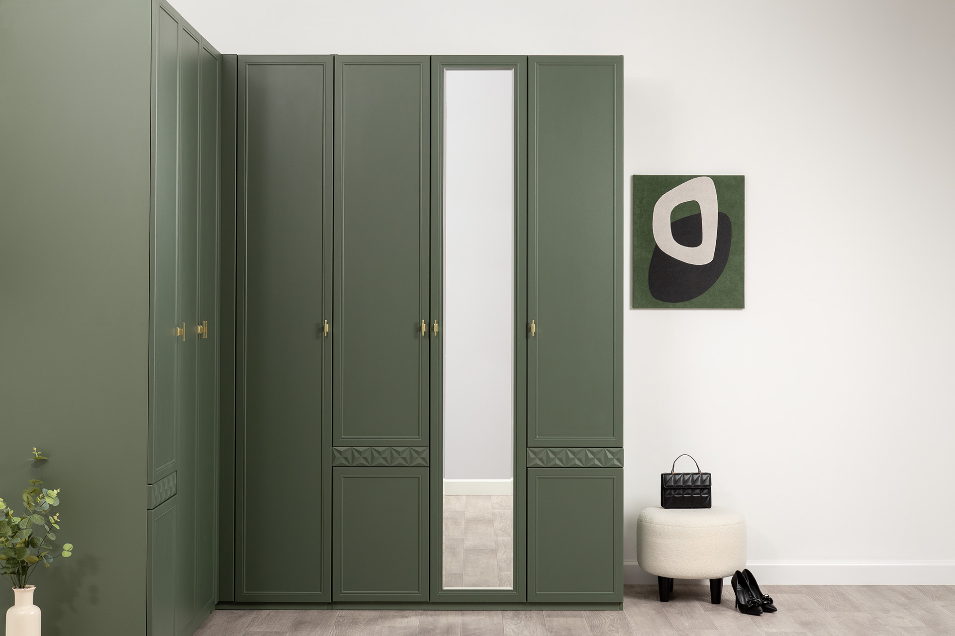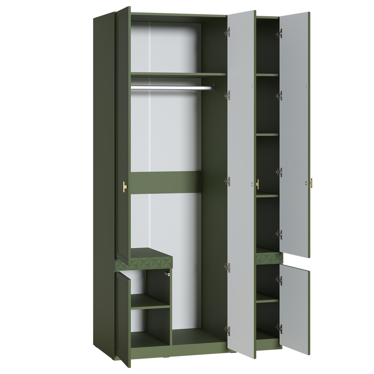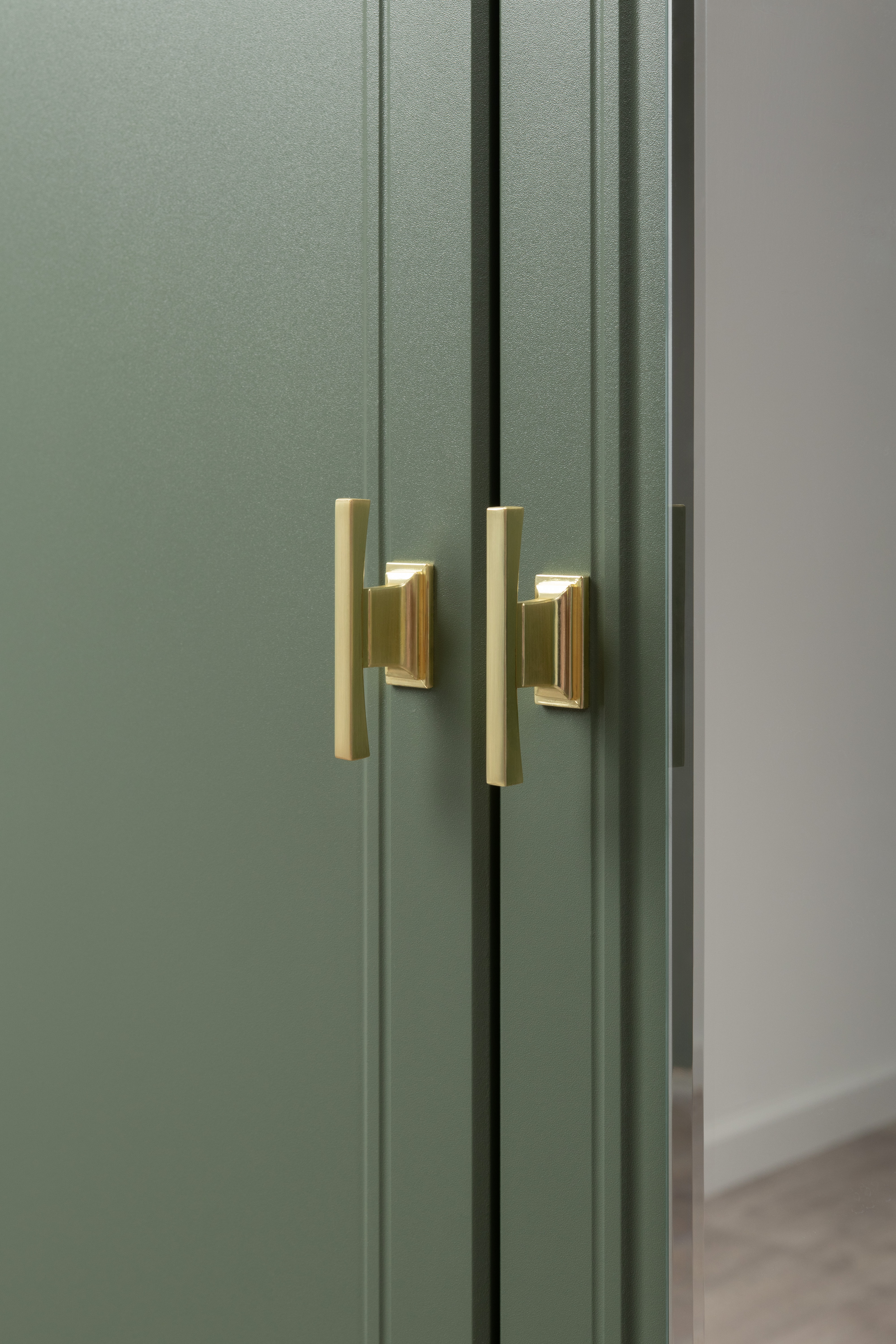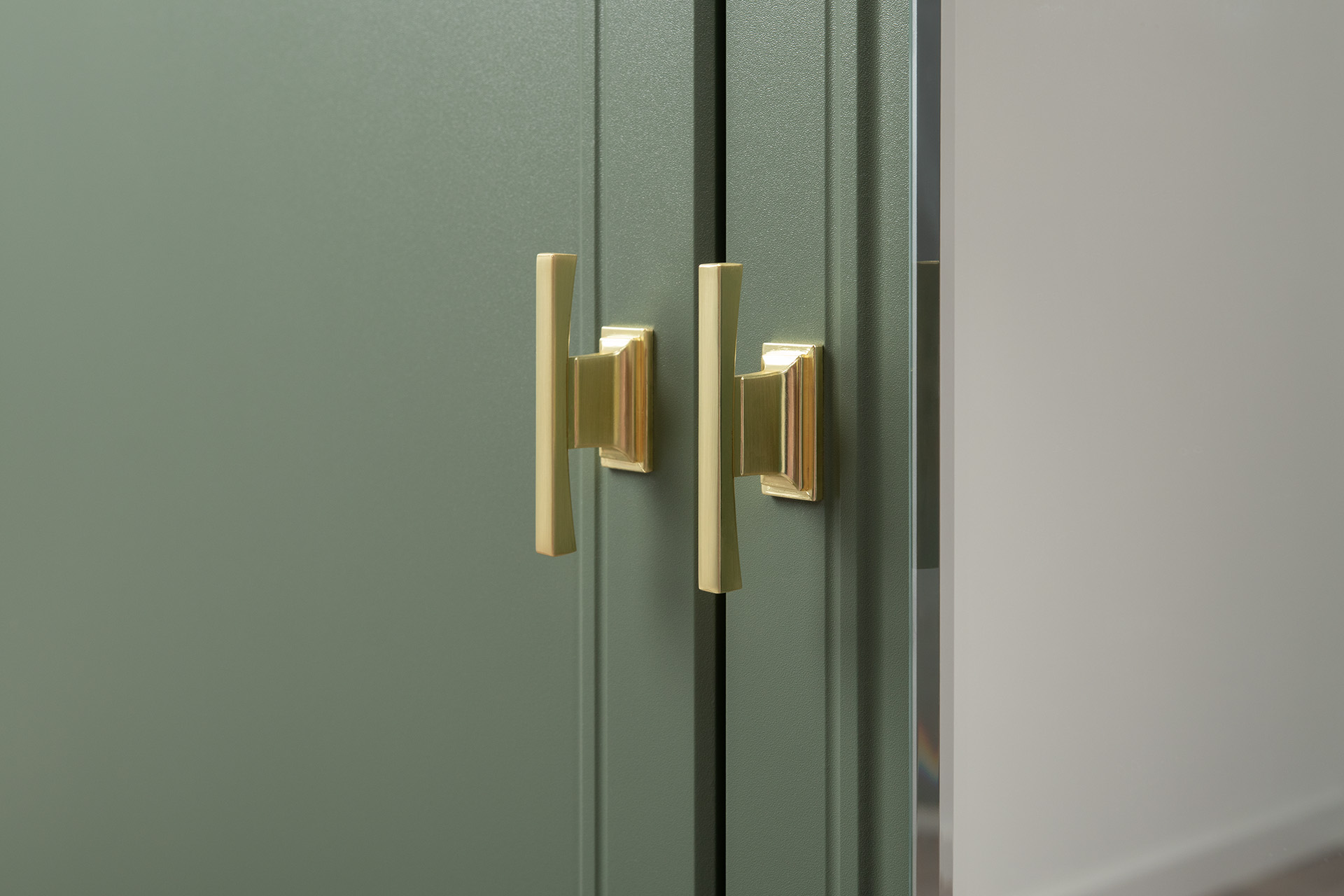 Изящные линии, глубокая фрезеровка фасадов из МДФ и благородные оттенки. Утончённая «Слоновая кость» и изысканная «Олива Шагрень» с глубоким зелёным тоном — создают атмосферу уюта, тепла и благородства. Металлические ручки и опоры золотого цвета придают мебели утончённый блеск, а петли и направляющие с доводчиками обеспечивают плавное и бесшумное закрытие фасадов.