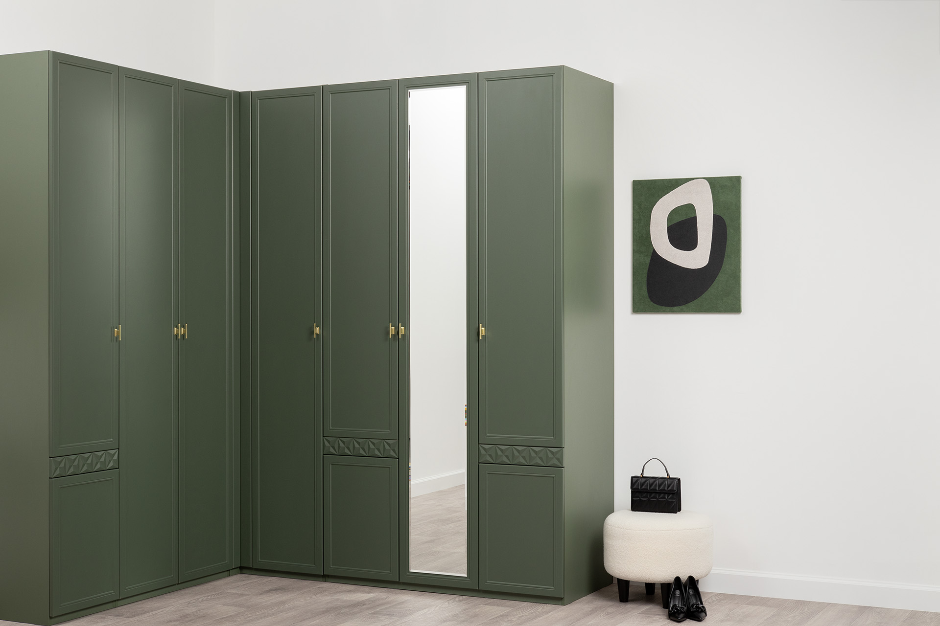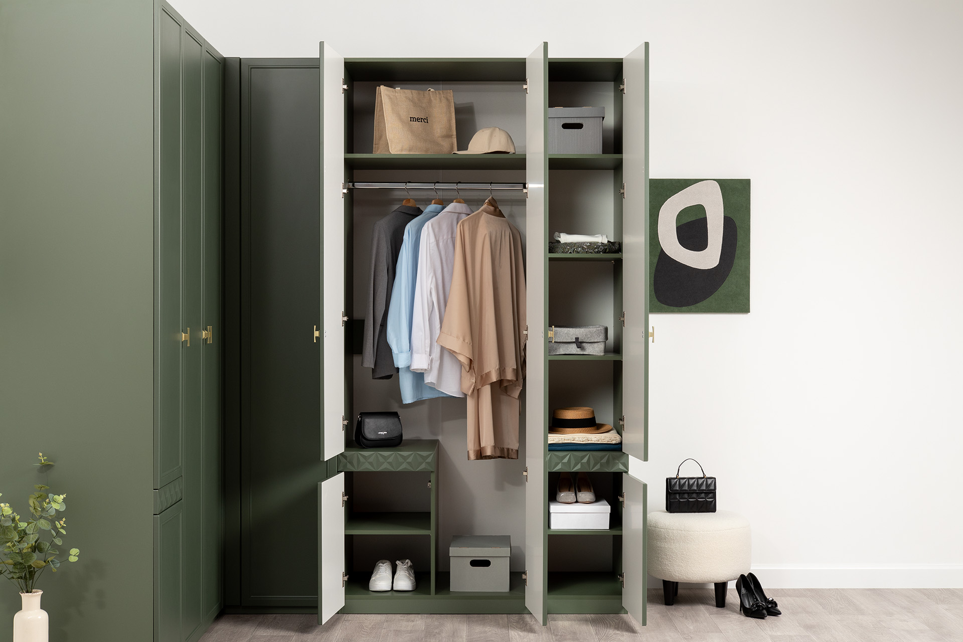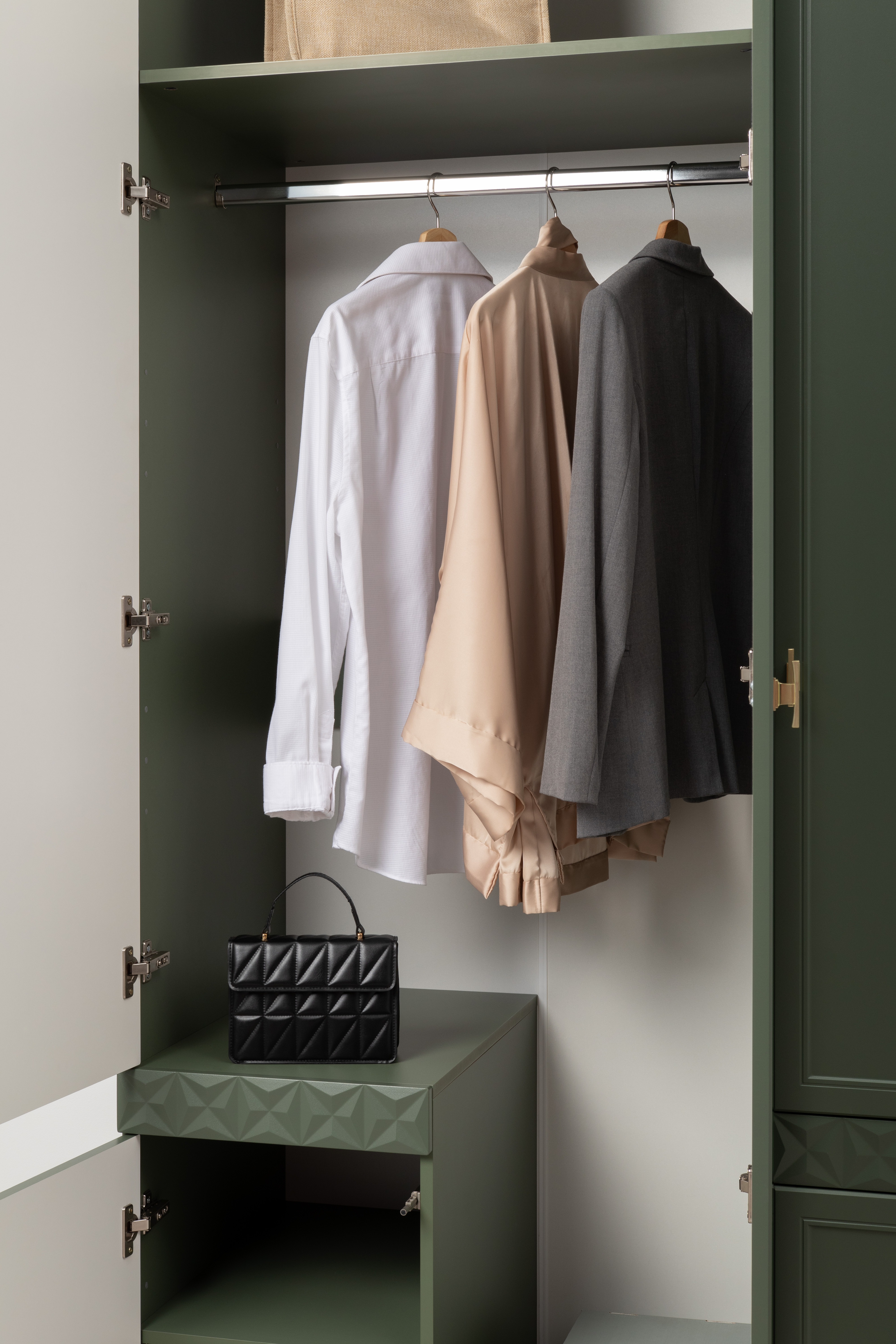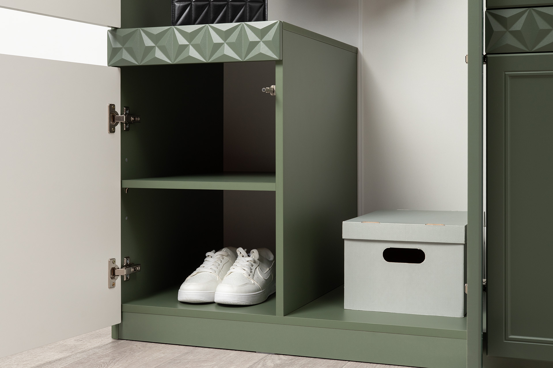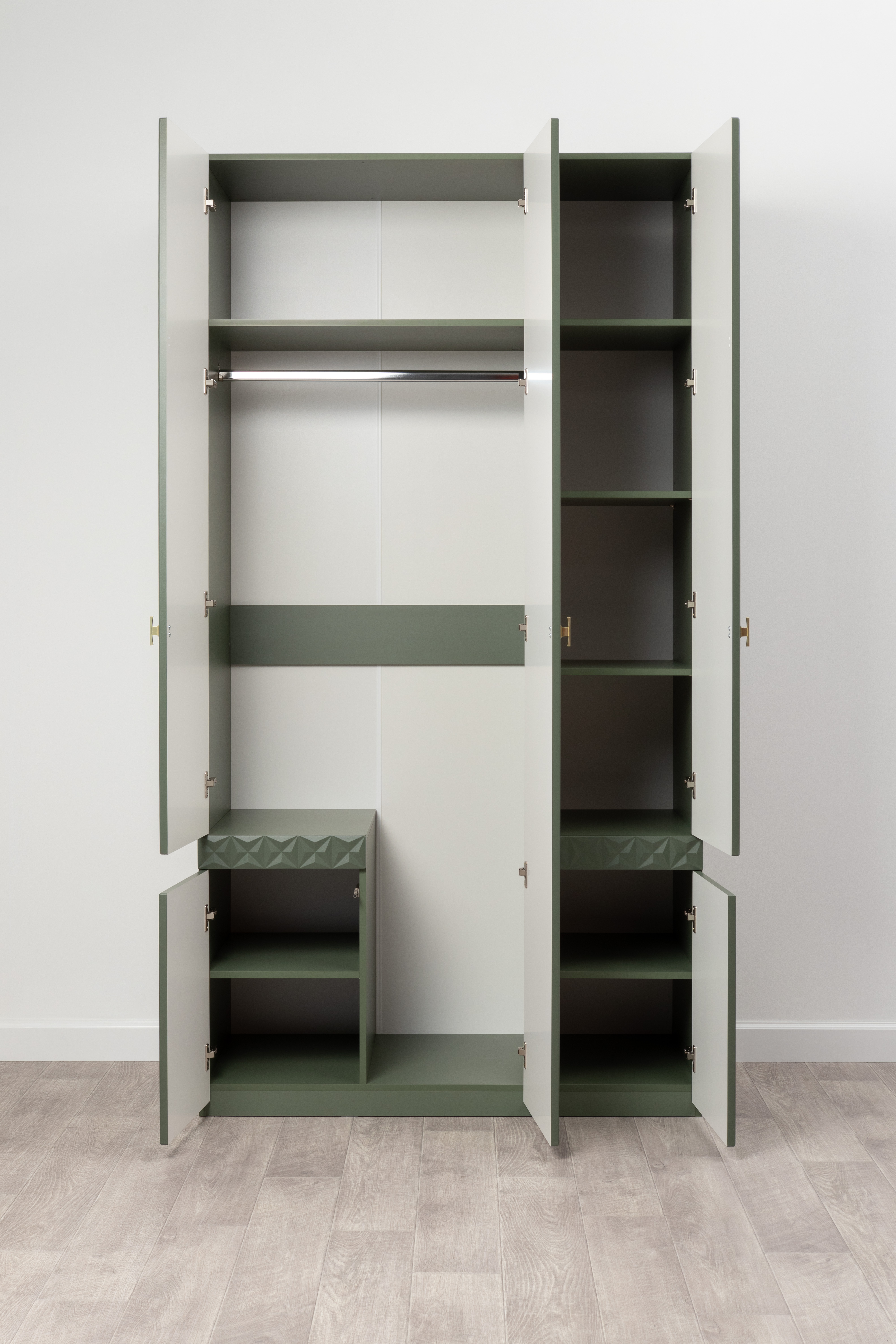 Изящные линии, глубокая фрезеровка фасадов из МДФ и благородные оттенки. Утончённая «Слоновая кость» и изысканная «Олива Шагрень» с глубоким зелёным тоном — создают атмосферу уюта, тепла и благородства. Металлические ручки и опоры золотого цвета придают мебели утончённый блеск, а петли и направляющие с доводчиками обеспечивают плавное и бесшумное закрытие фасадов.