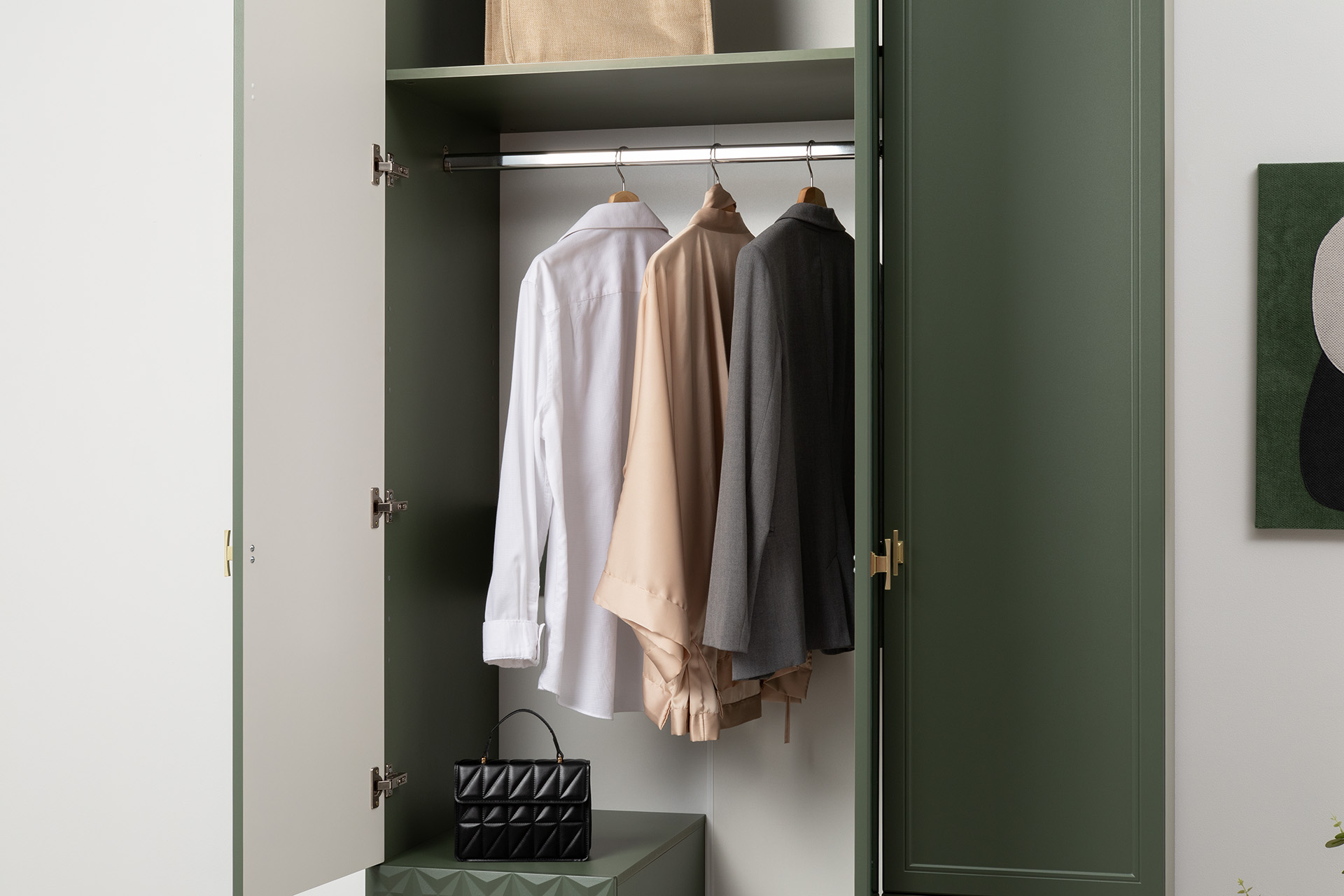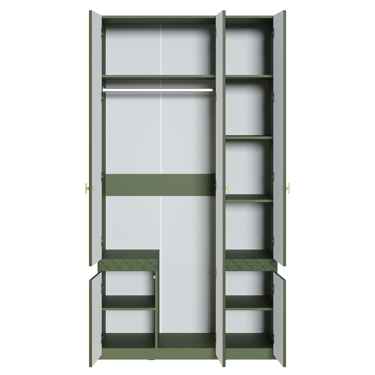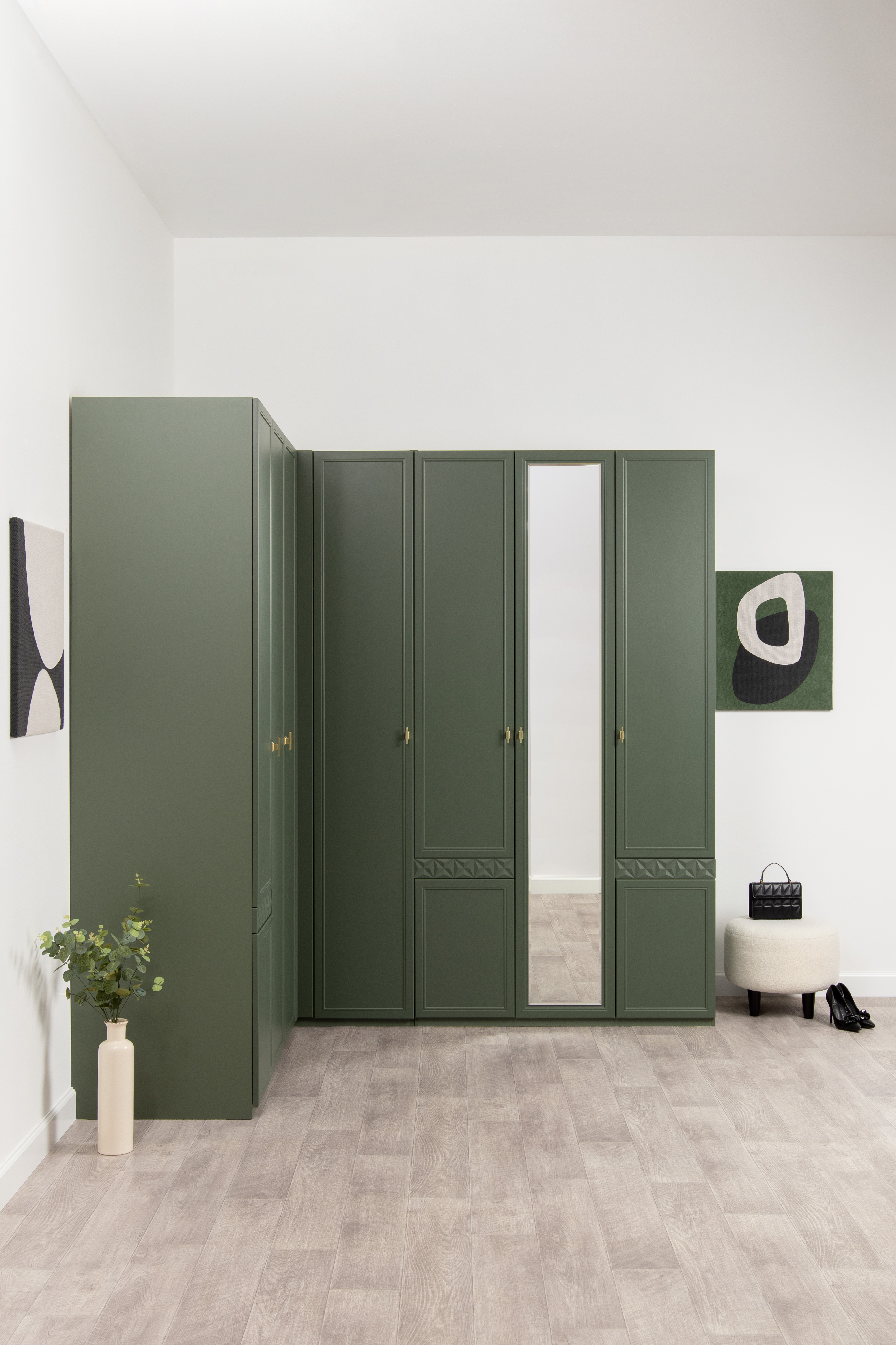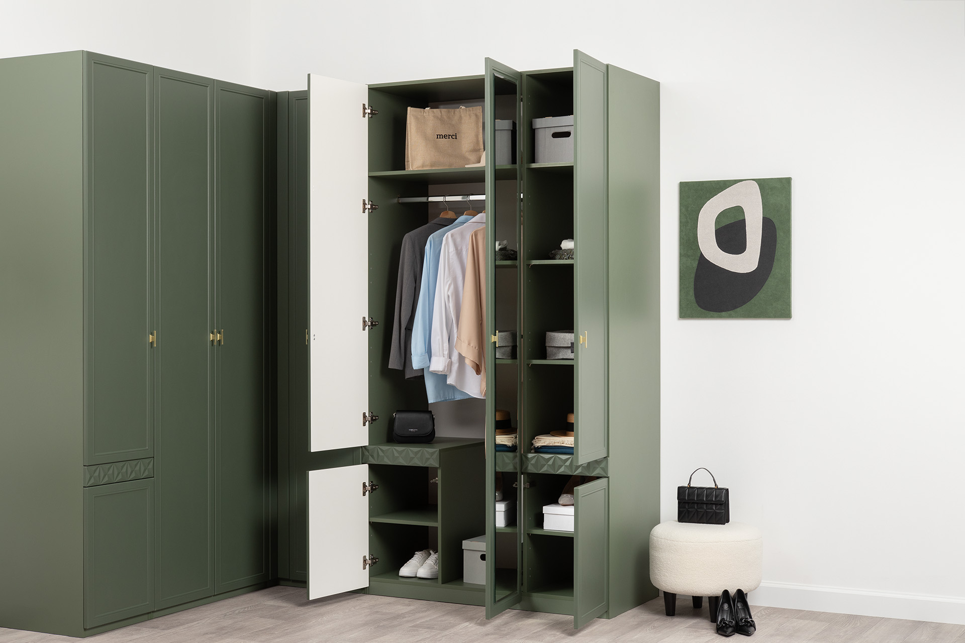 Изящные линии, глубокая фрезеровка фасадов из МДФ и благородные оттенки. Утончённая «Слоновая кость» и изысканная «Олива Шагрень» с глубоким зелёным тоном — создают атмосферу уюта, тепла и благородства. Металлические ручки и опоры золотого цвета придают мебели утончённый блеск, а петли и направляющие с доводчиками обеспечивают плавное и бесшумное закрытие фасадов.
