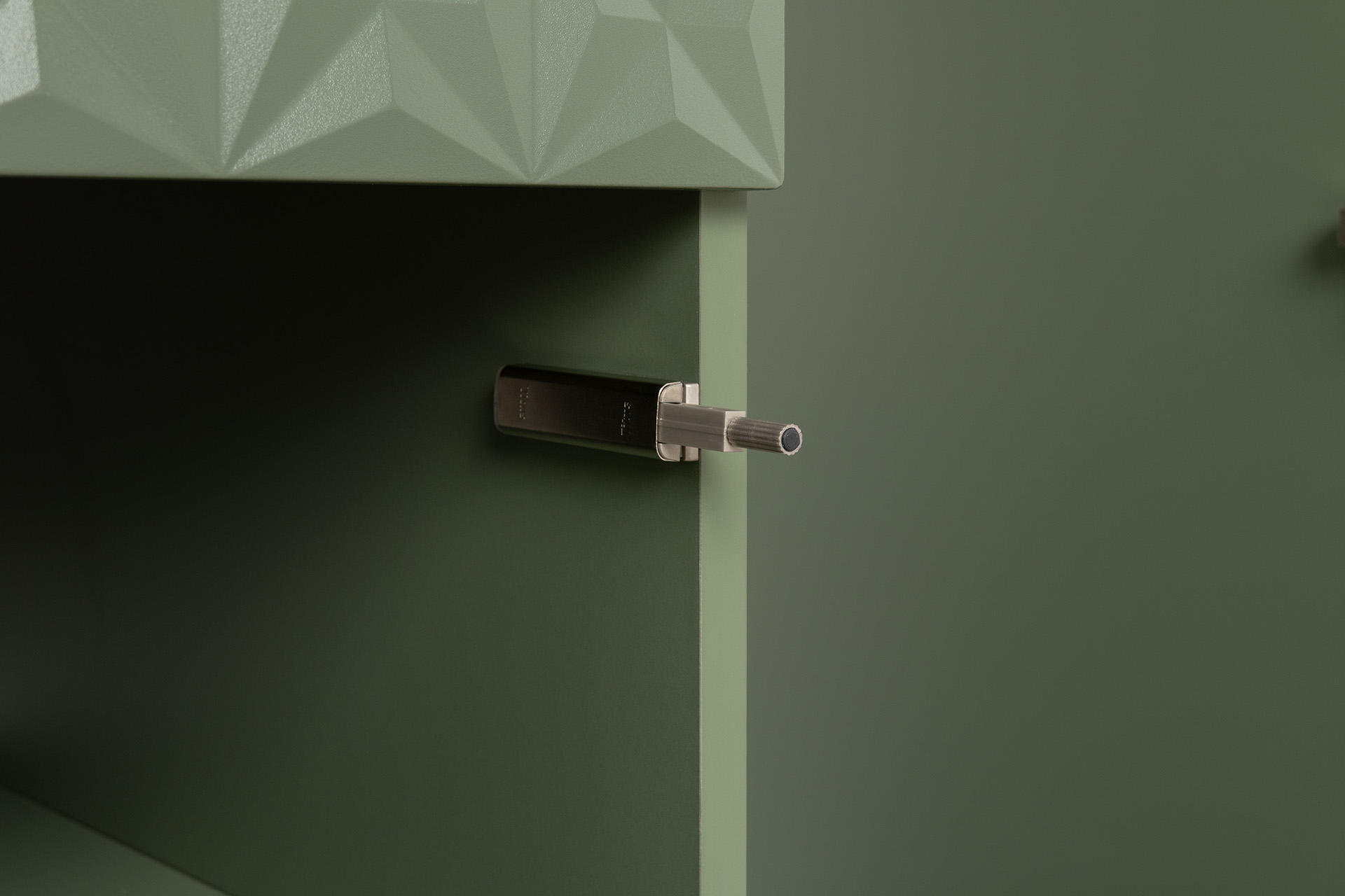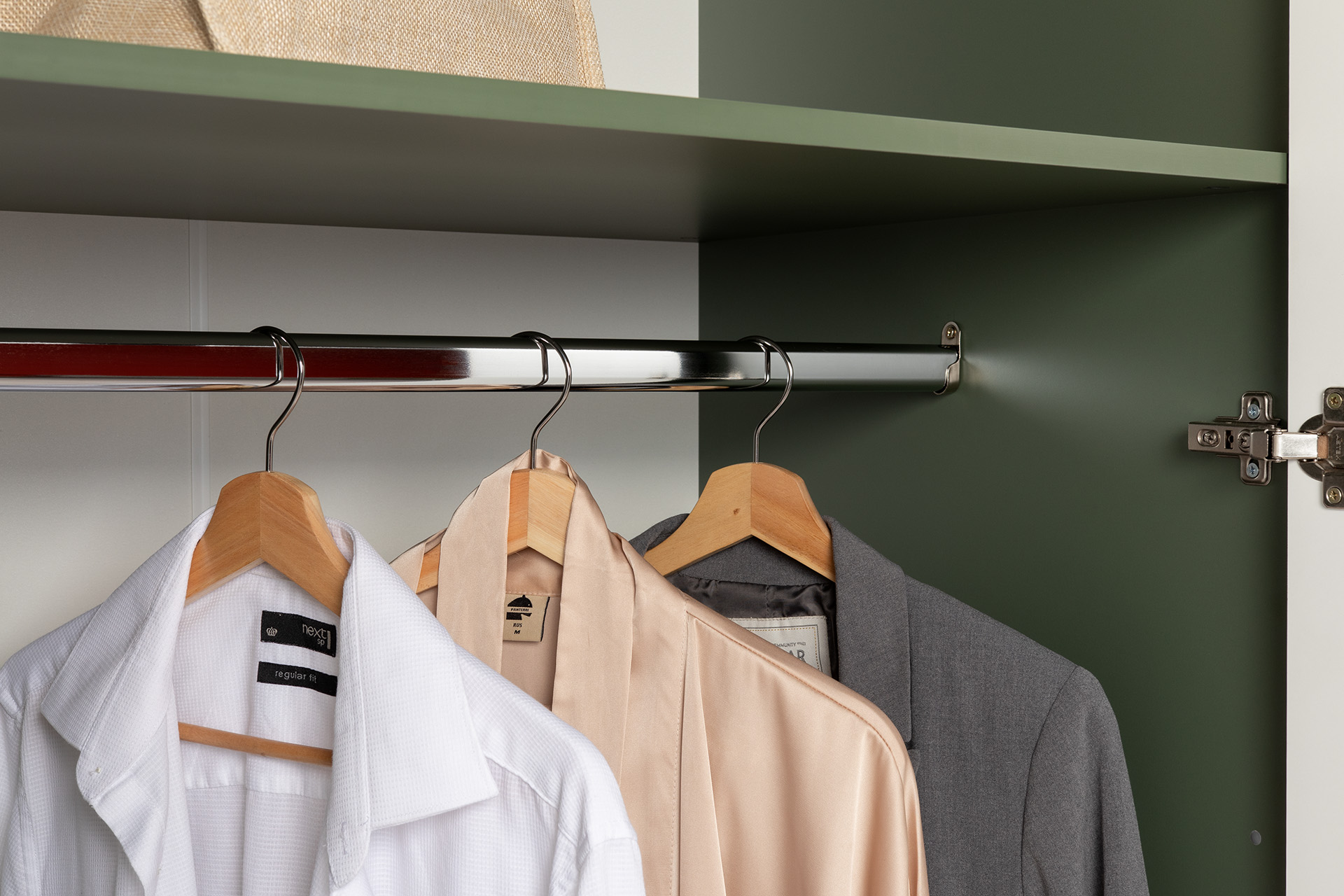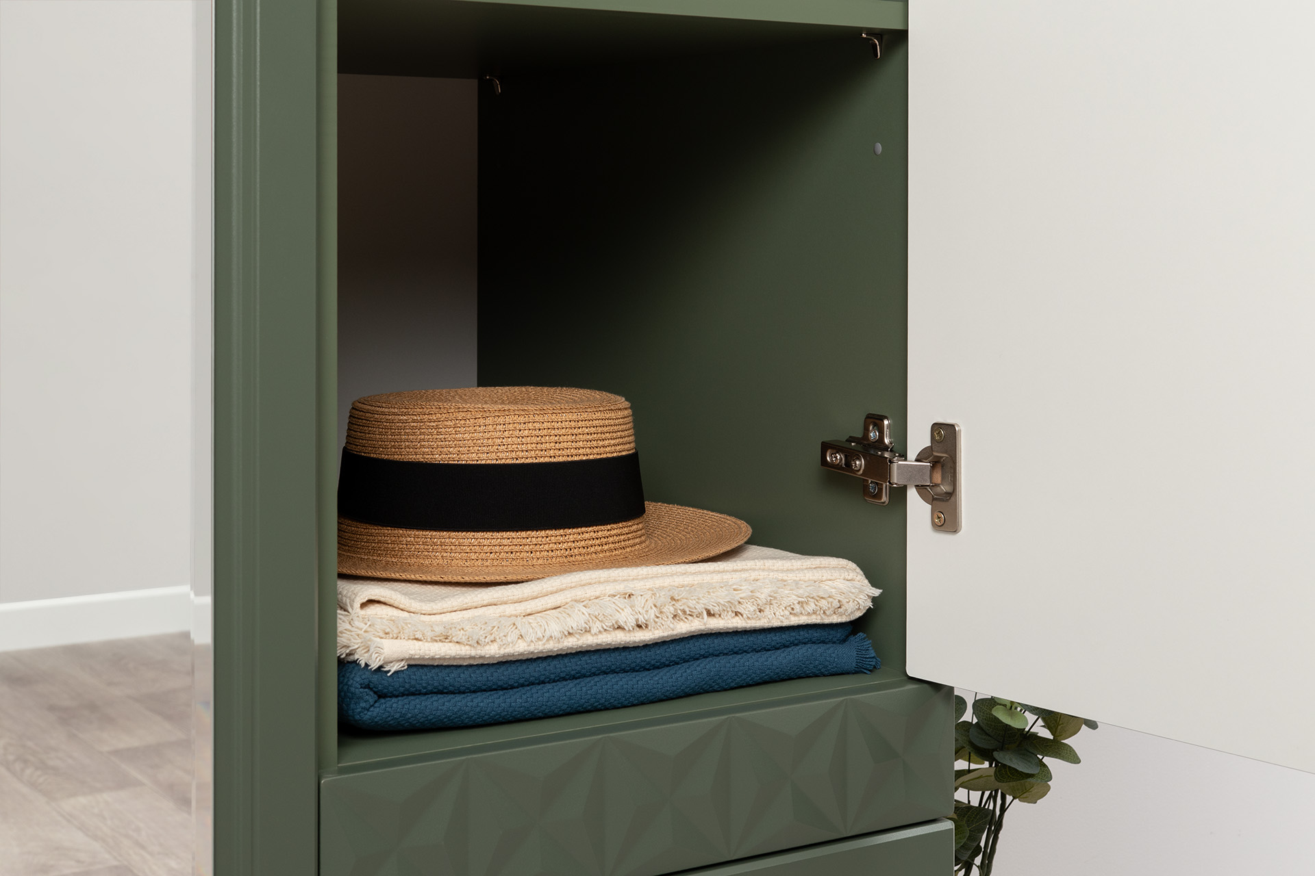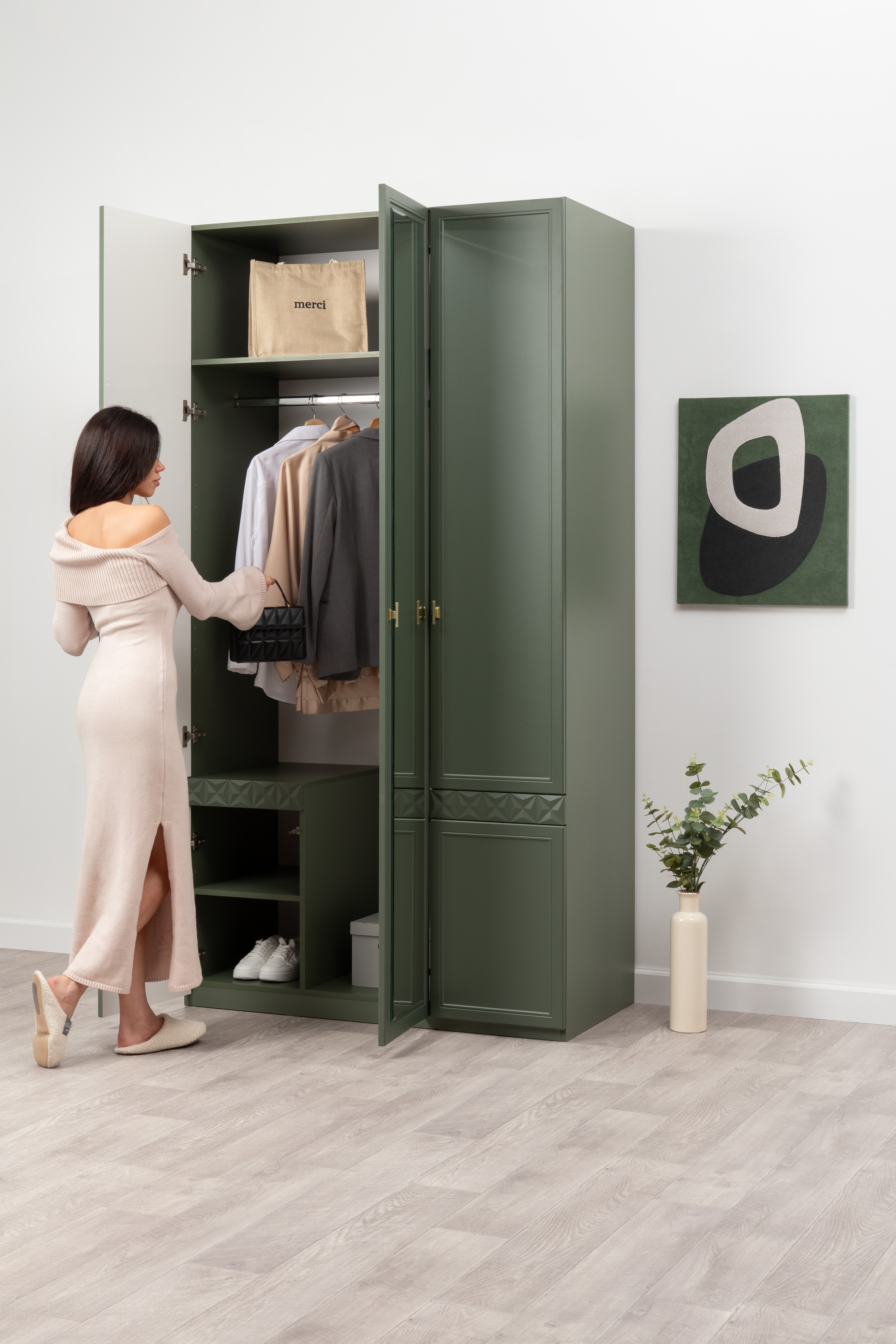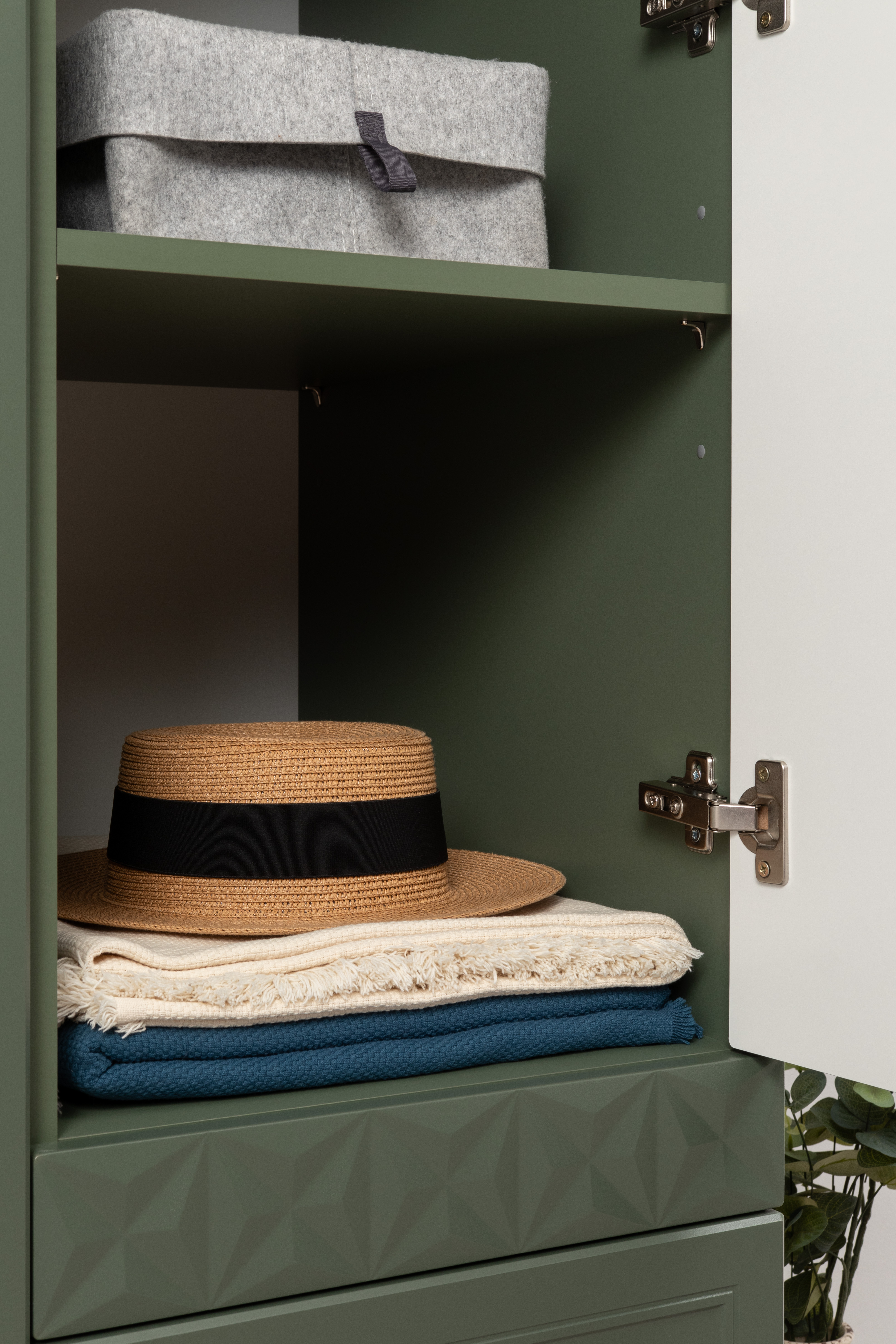 Изящные линии, глубокая фрезеровка фасадов из МДФ и благородные оттенки. Утончённая «Слоновая кость» и изысканная «Олива Шагрень» с глубоким зелёным тоном — создают атмосферу уюта, тепла и благородства. Металлические ручки и опоры золотого цвета придают мебели утончённый блеск, а петли и направляющие с доводчиками обеспечивают плавное и бесшумное закрытие фасадов.